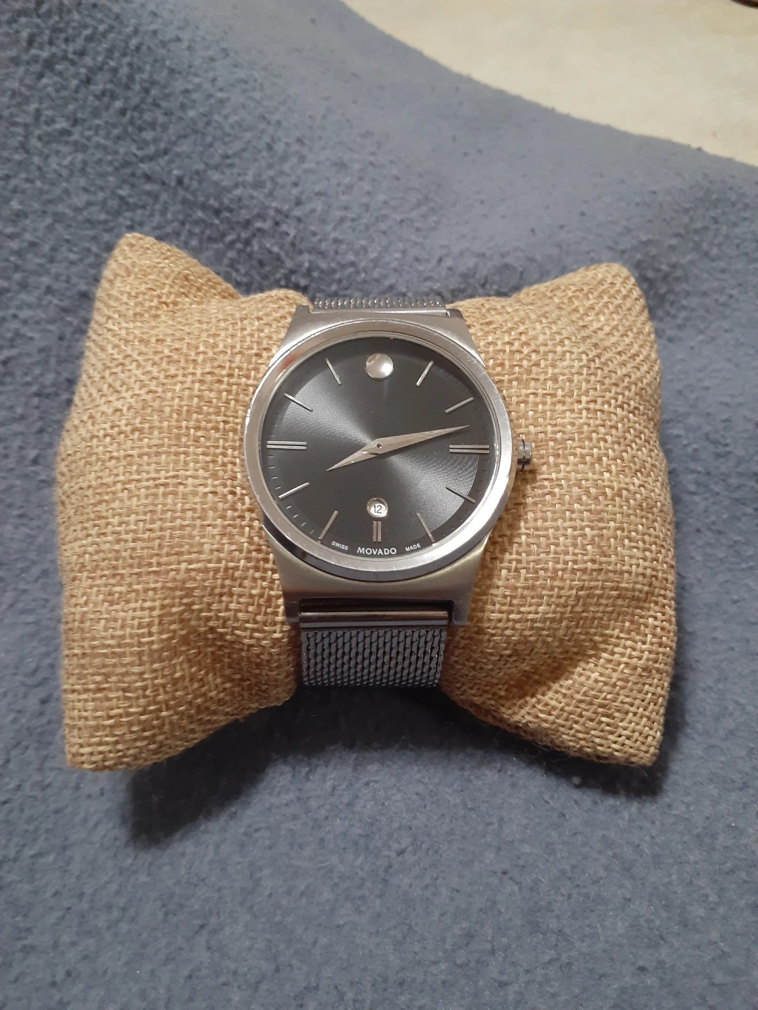 Swiss made Movado watch with a stainless steel mesh band. It features a black dial and a date display...