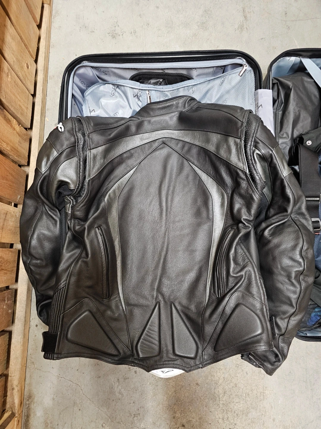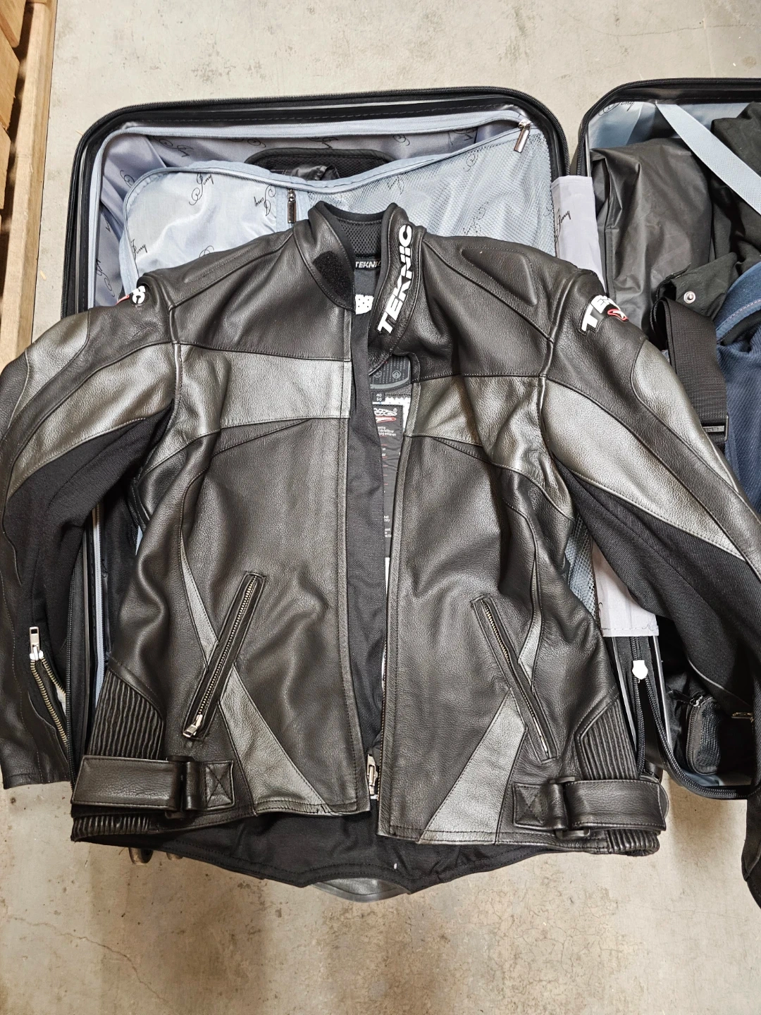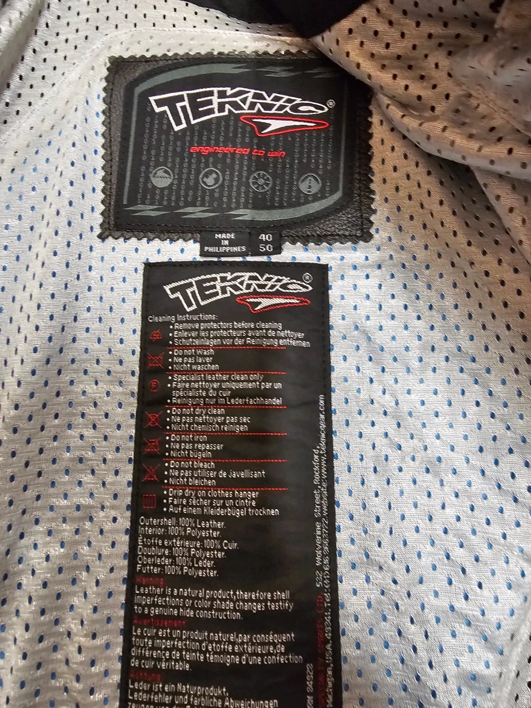 Teknic leather motorcycle jacket, size 40, fits a little on the small side.. Outer shell is 100% leather with a 100% polyester lining. Features a genuine hide construction.