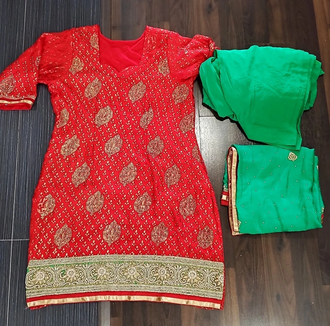 Beautiful red and green salwar kameez with intricate embroidery. Perfect for special occasions! The set includes the kameez (top), salwar (pants), and dupatta (scarf). The fabric is soft and comfortable. The embroidery adds a touch of elegance and sophistication to the outfit