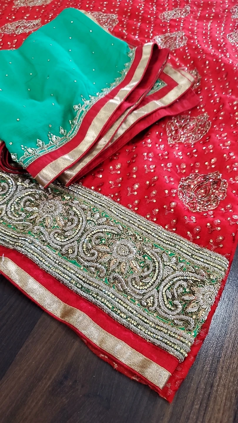 Beautiful red and green salwar kameez with intricate embroidery. Perfect for special occasions! The set includes the kameez (top), salwar (pants), and dupatta (scarf). The fabric is soft and comfortable. The embroidery adds a touch of elegance and sophistication to the outfit