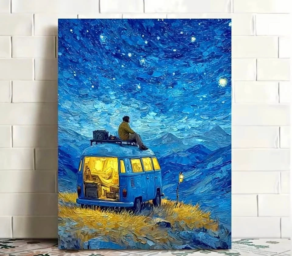 Hooks are attached on the back for easy wall hanging. A dreamy, textured rendition of a blue camper van under a swirling starry sky, inspired by Van Gogh’s masterpiece. Perfect decorative piece for modern homes or outdoor vibes. Check my marketplace for an exclusive collection of more designs and various sizes to fit your space.