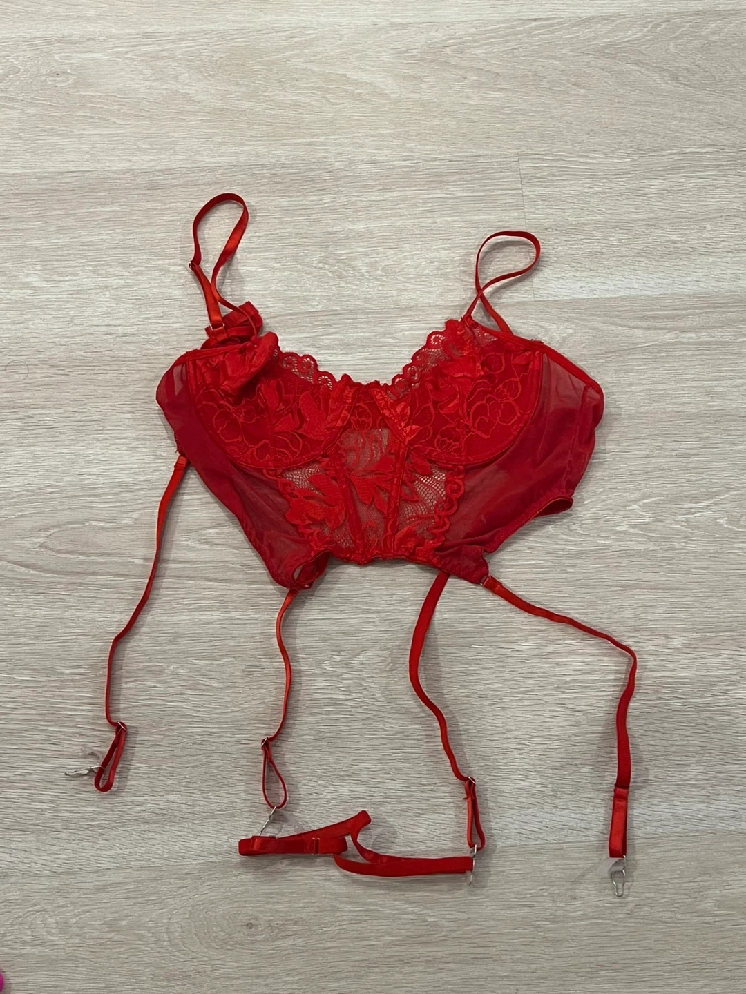 This is a red lace corset with adjustable garter straps. It's made with sheer mesh and floral lace detailing. It has adjustable shoulder straps. Open to offers and check out my other listings for discounts!