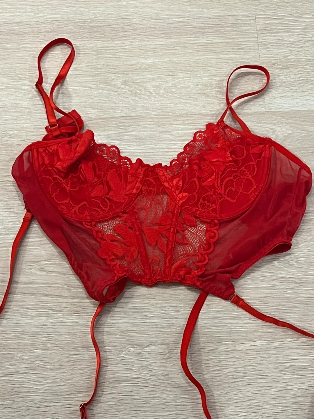 This is a red lace corset with adjustable garter straps. It's made with sheer mesh and floral lace detailing. It has adjustable shoulder straps. Open to offers and check out my other listings for discounts!