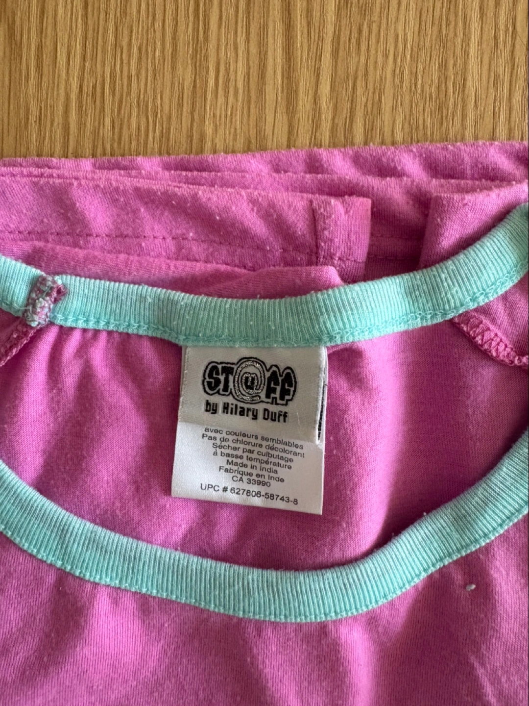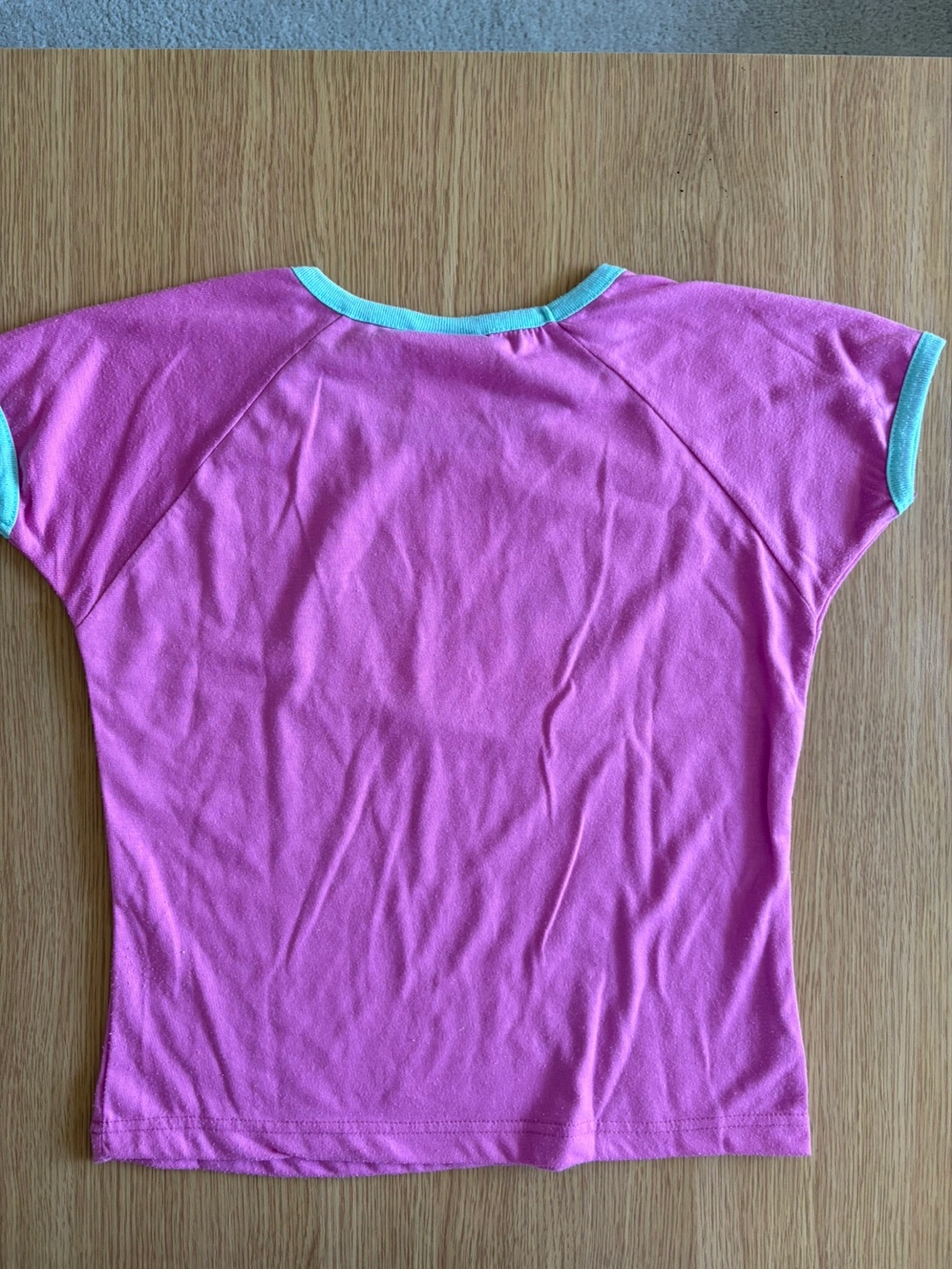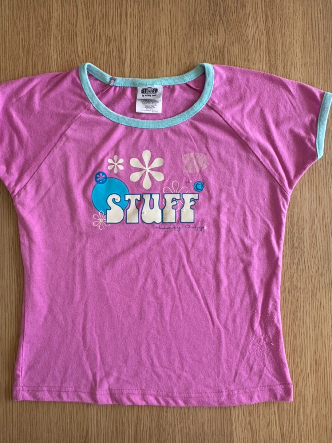 Cute pink t-shirt by Stuff by Hilary Duff. It has a light blue trim around the neck and sleeves. Perfect for a casual, fun look. Size XL.