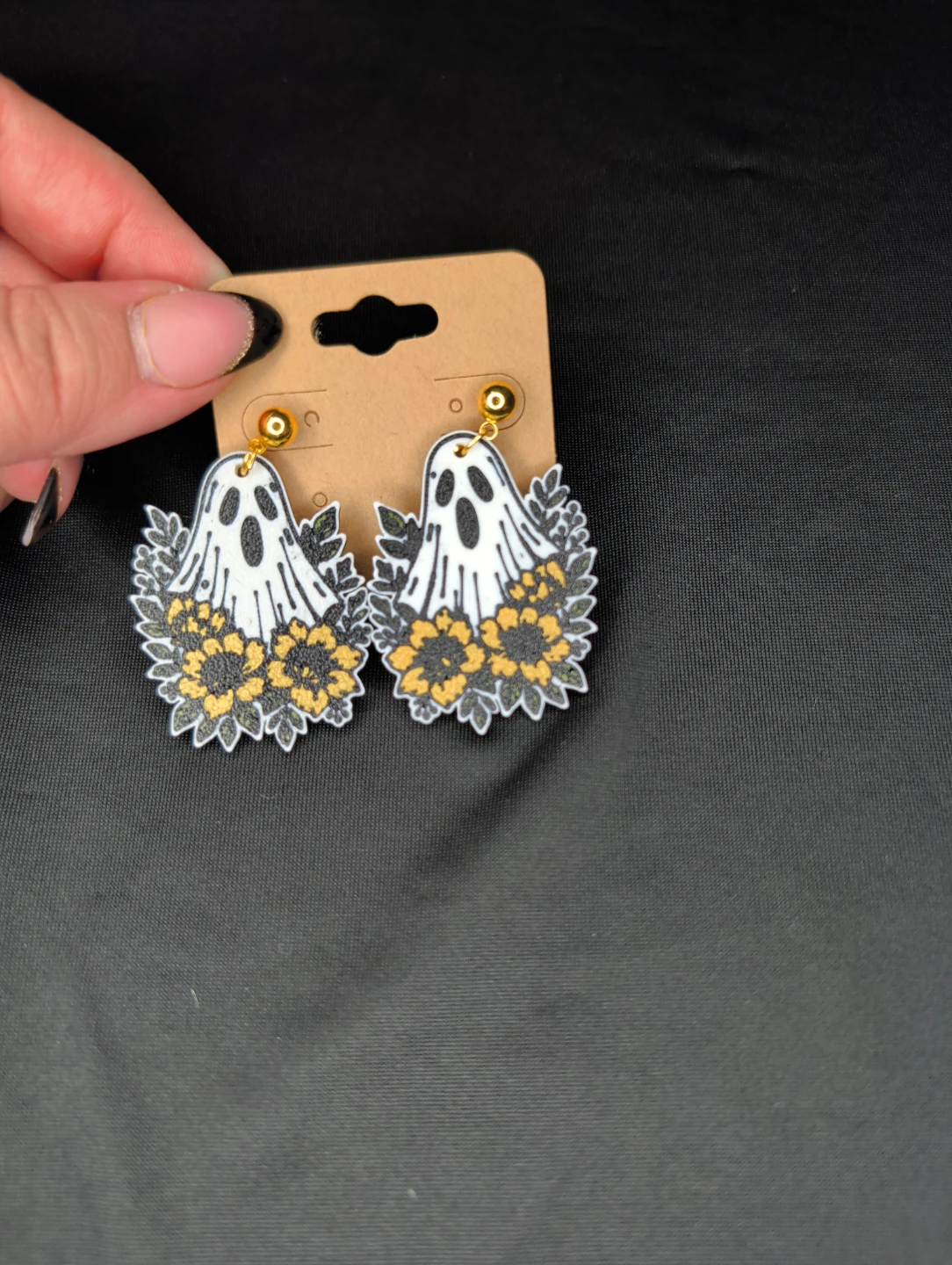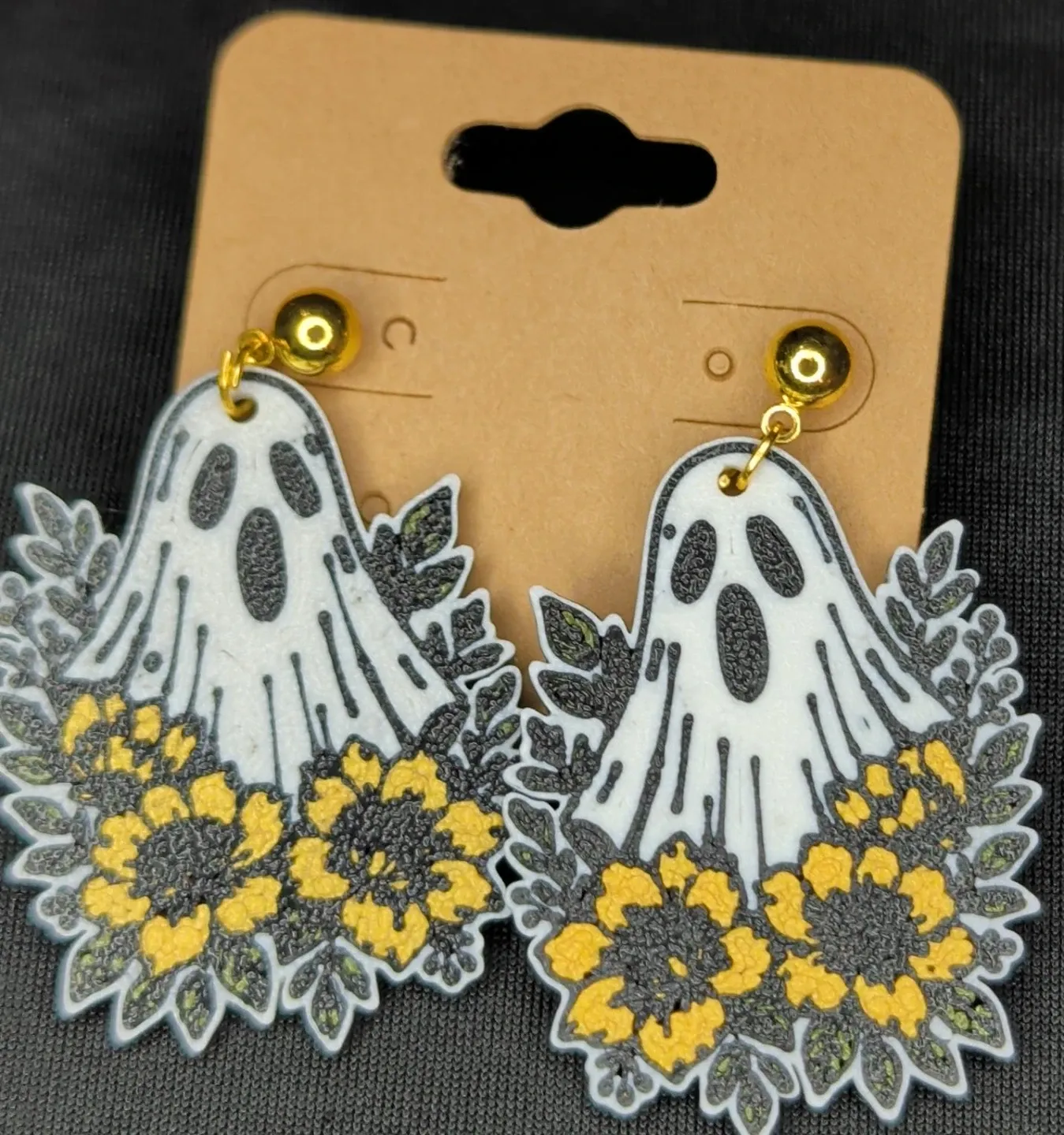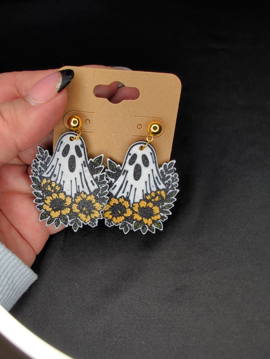 Cute ghost and sunflower dangle earrings! These earrings have a fun, spooky-yet-sweet design perfect for fall. They're lightweight and ready to wear.