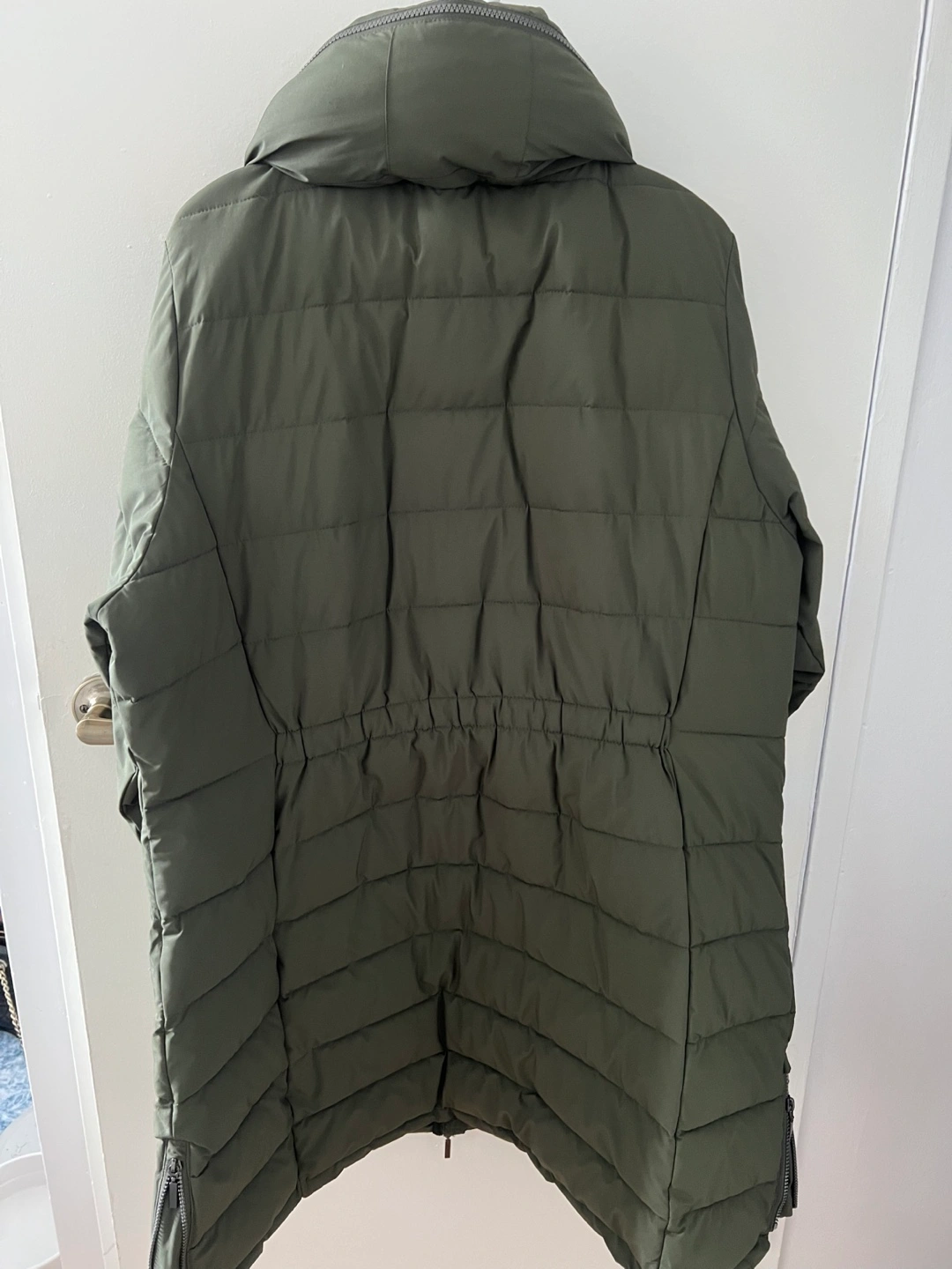 Long olive green puffer jacket. Features a high collar, zipper closure, and side pockets. Drawstring waist. Excellent for colder weather. Pickup and cash only in Scarborough