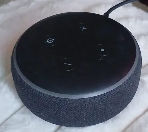 This is an Amazon Echo Dot, 3rd generation. It's charcoal colored. This smart speaker allows voice control for music and smart home devices.