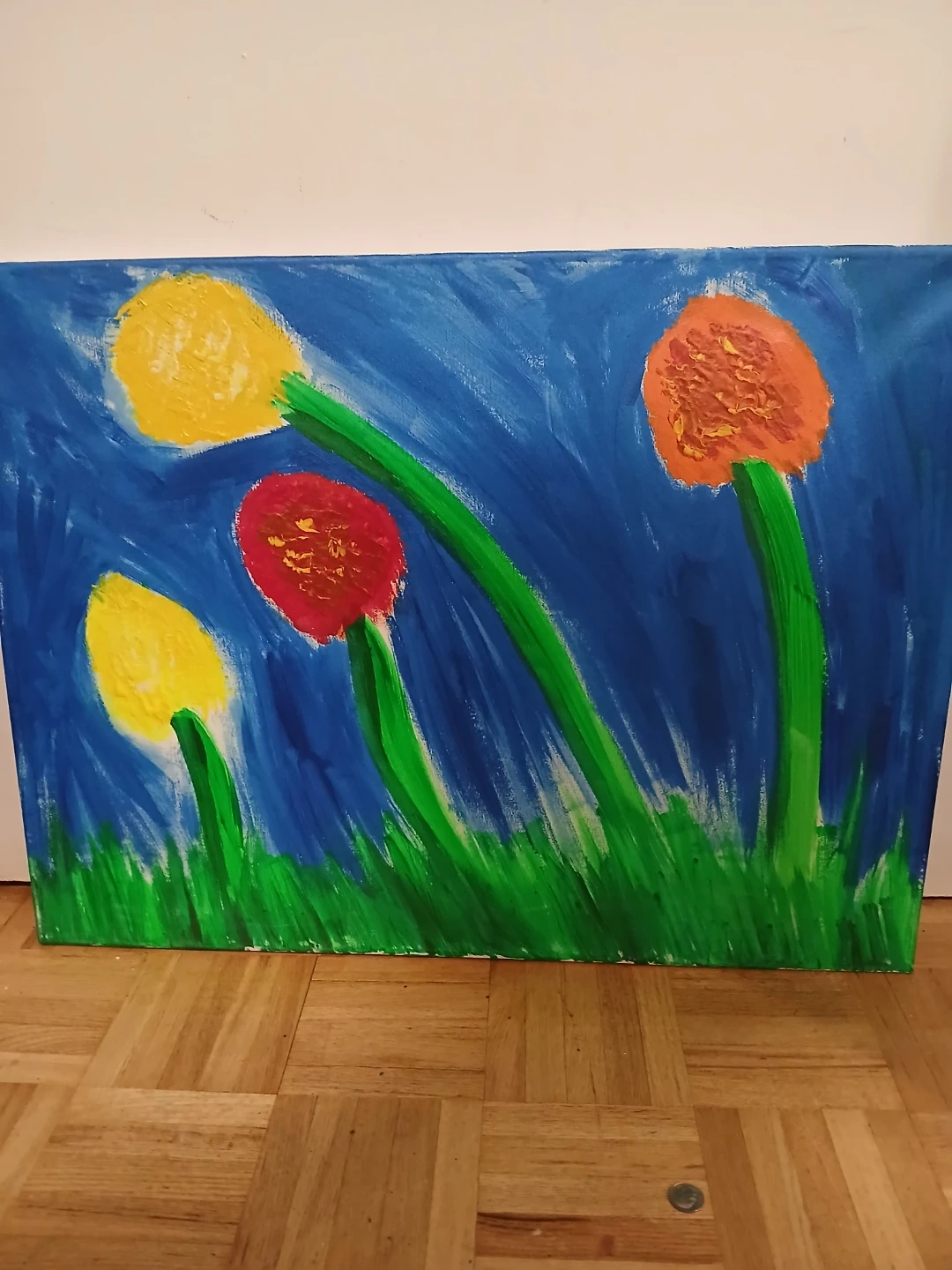 Canvas painting featuring bold strokes of yellow, red, and orange flowers against a vibrant blue background. Lush green grass accents the bottom of the artwork. It's a lively piece that adds a pop of colour to any space.