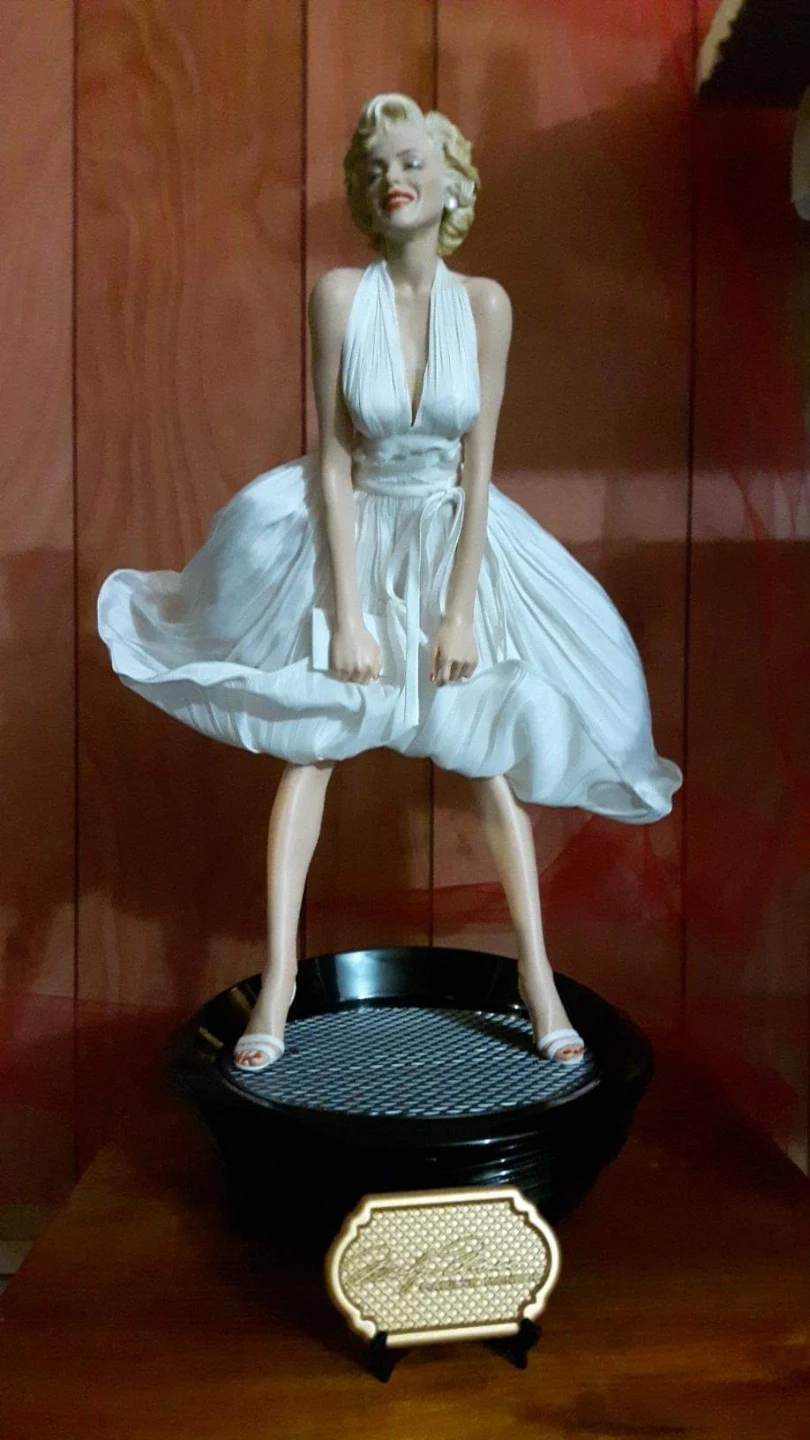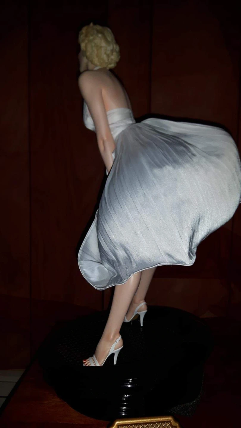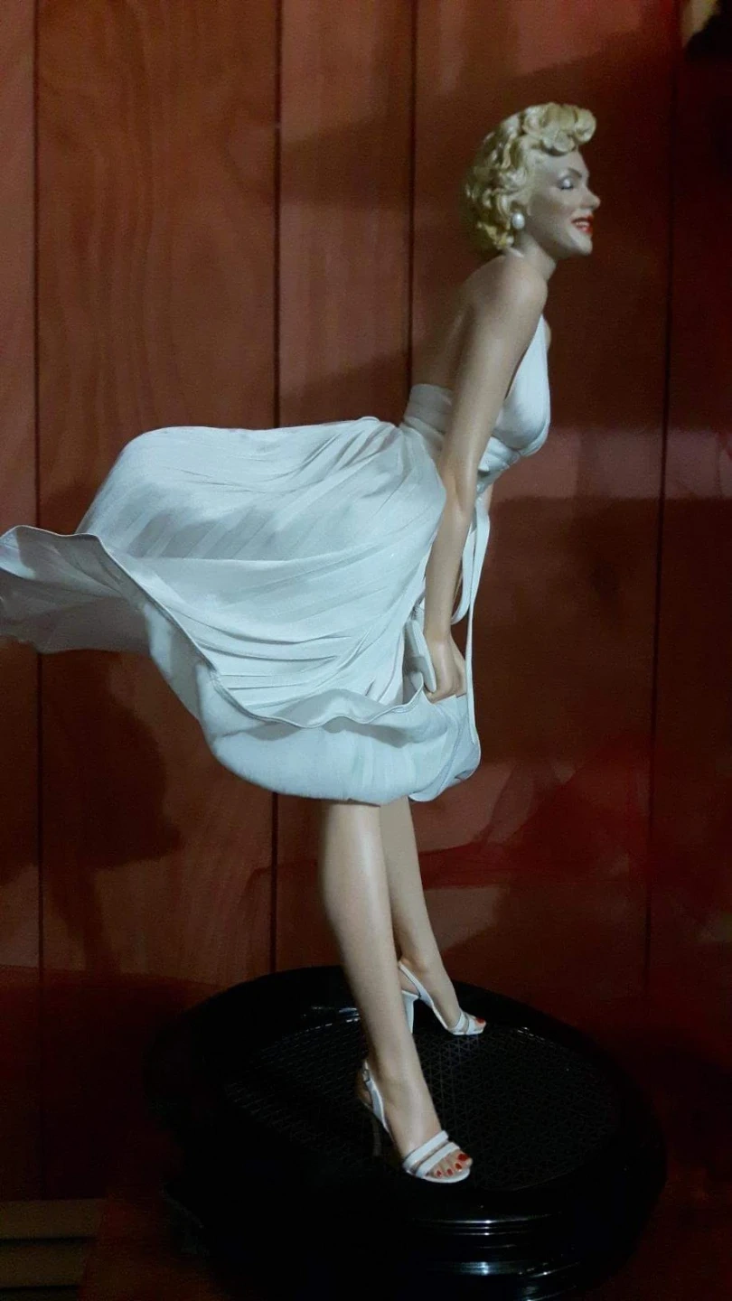 This is a detailed statue of Marilyn Monroe in her iconic white dress pose. It's crafted with high-quality materials and features realistic detailing. The statue comes in its original packaging. She also turns around, but I can't get the video to show it.Won't let me put it up.But she turns around also