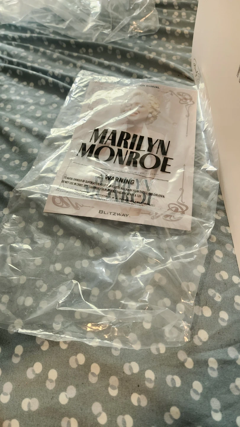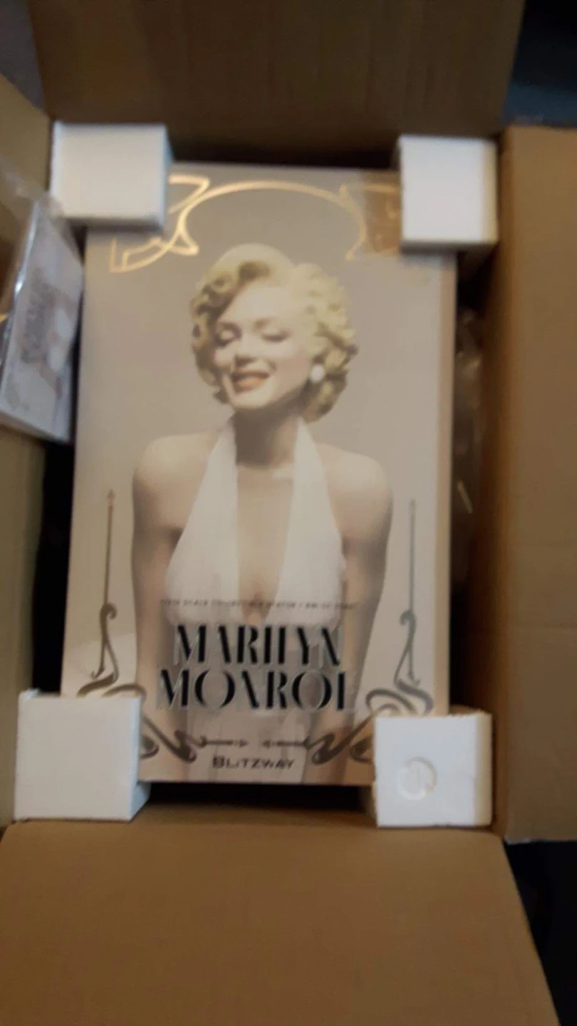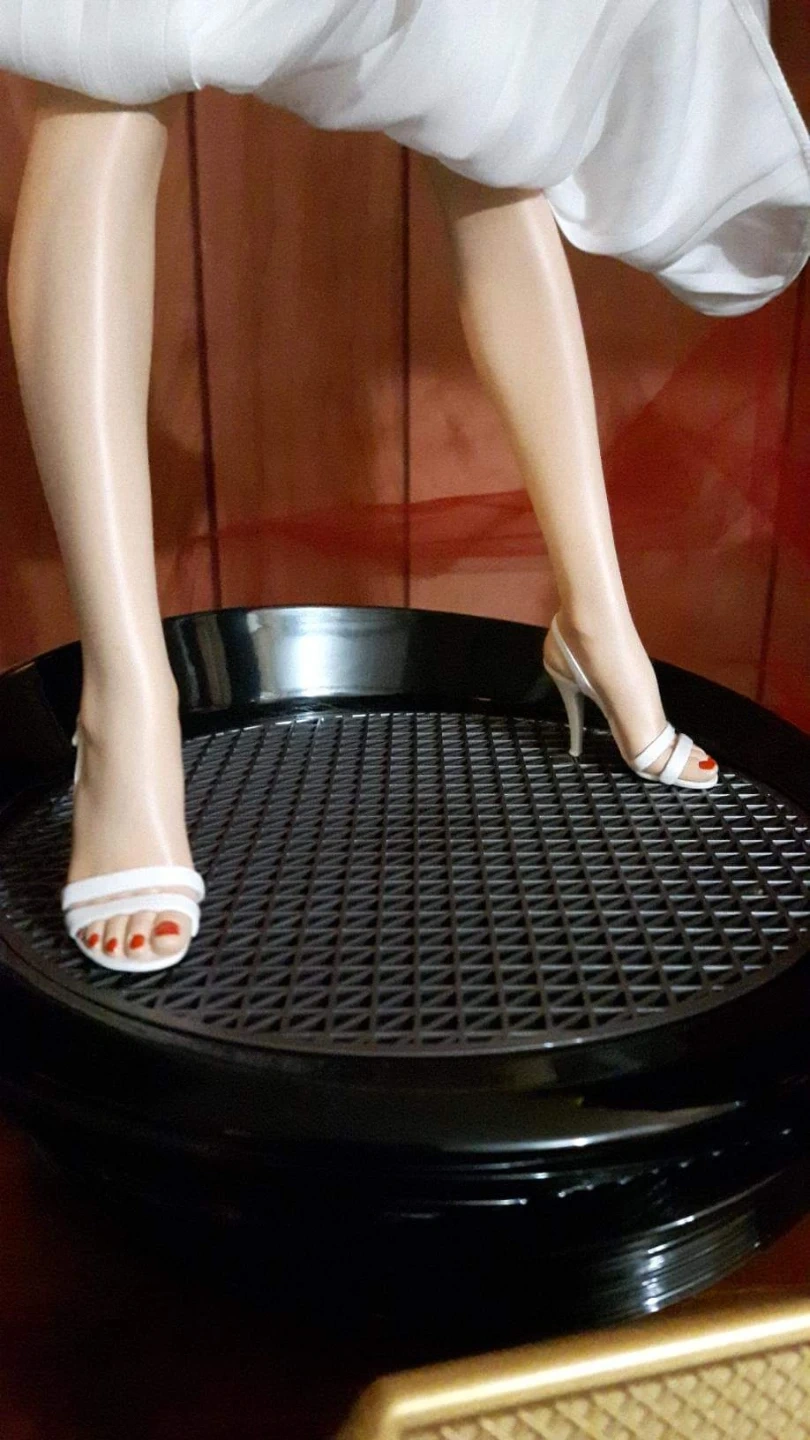 This is a detailed statue of Marilyn Monroe in her iconic white dress pose. It's crafted with high-quality materials and features realistic detailing. The statue comes in its original packaging. She also turns around, but I can't get the video to show it.Won't let me put it up.But she turns around also