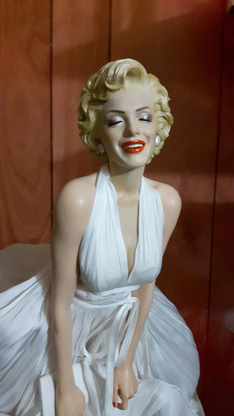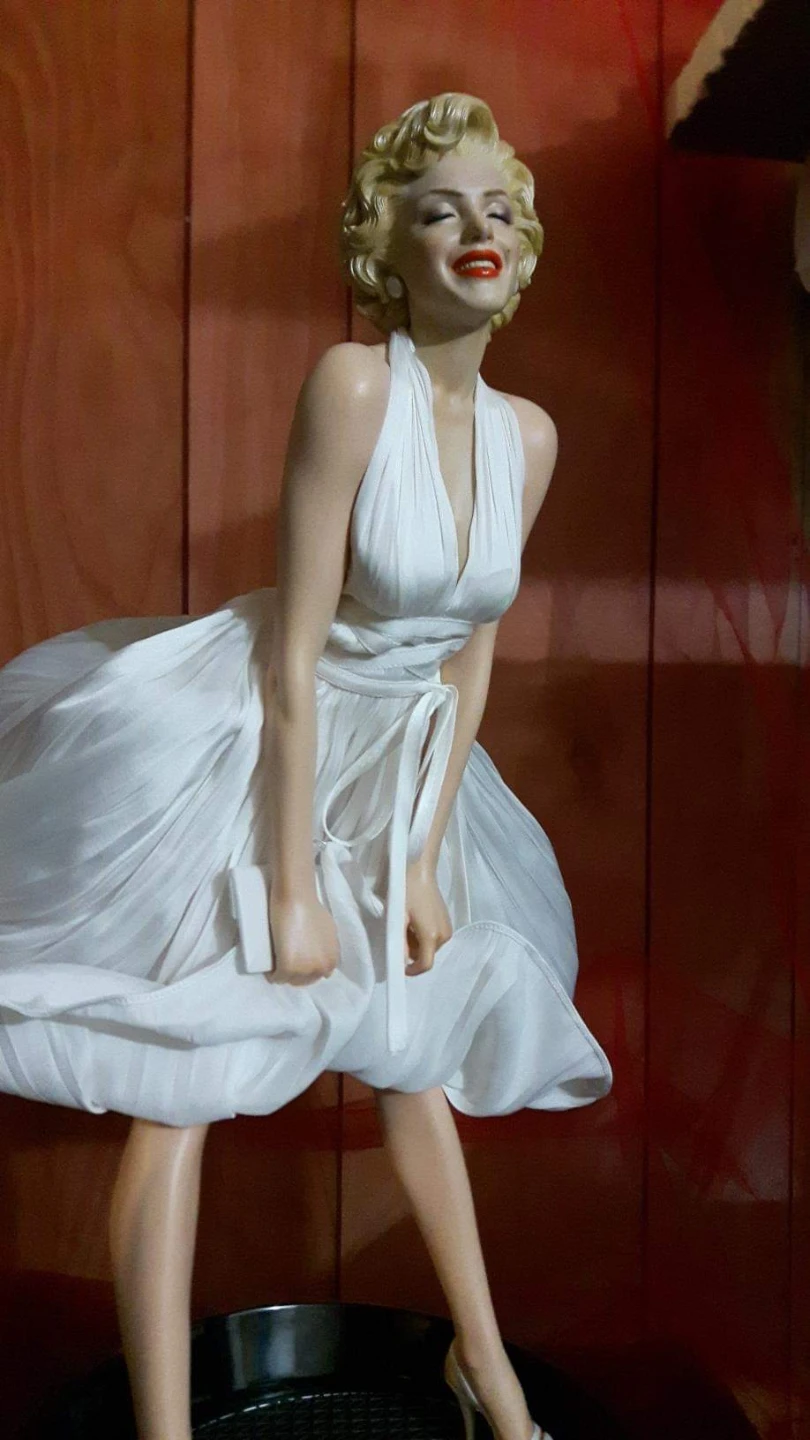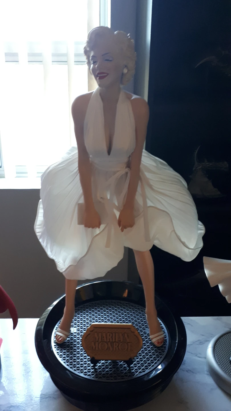 This is a detailed statue of Marilyn Monroe in her iconic white dress pose. It's crafted with high-quality materials and features realistic detailing. The statue comes in its original packaging. She also turns around, but I can't get the video to show it.Won't let me put it up.But she turns around also