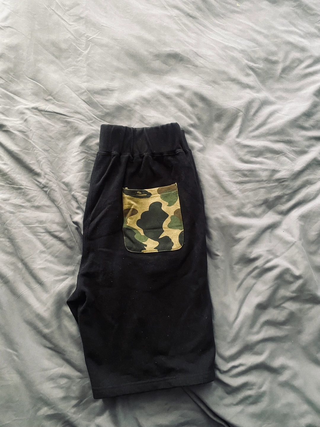 Selling a BAPE set including black shorts and pants. The shorts have a camo pocket on the back. The pants feature the iconic BAPE shark design. Great for casual wear!