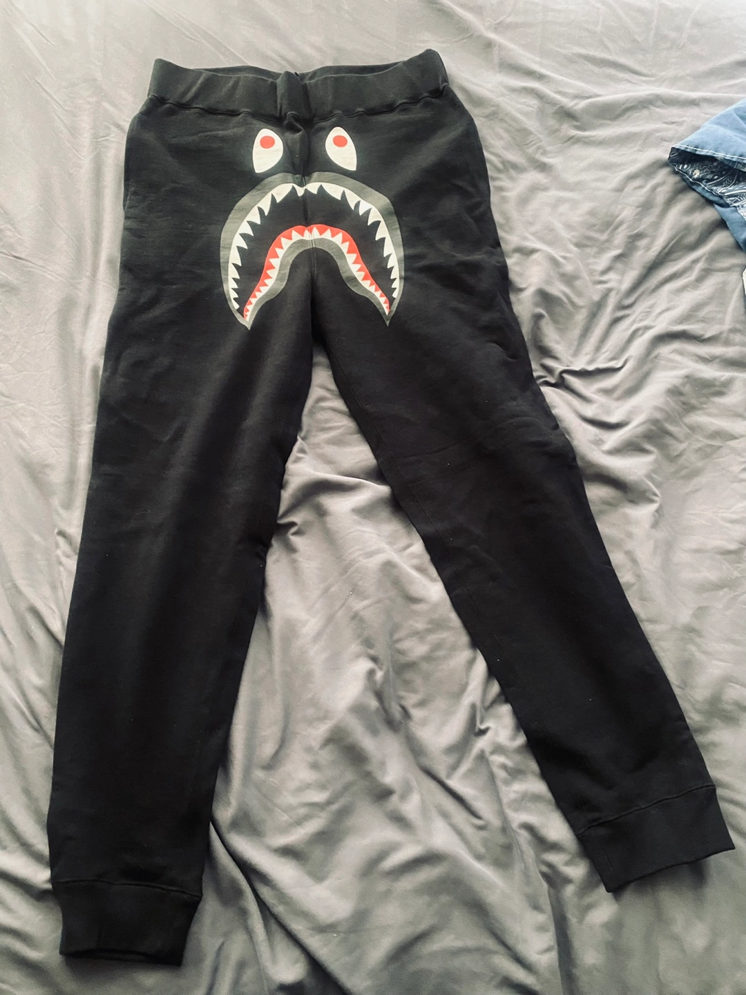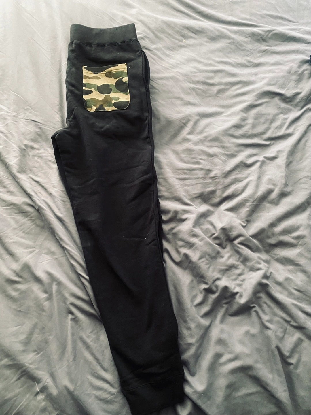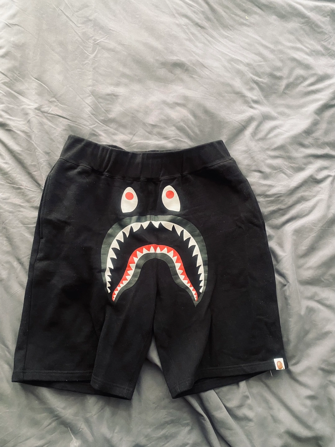 Selling a BAPE set including black shorts and pants. The shorts have a camo pocket on the back. The pants feature the iconic BAPE shark design. Great for casual wear!