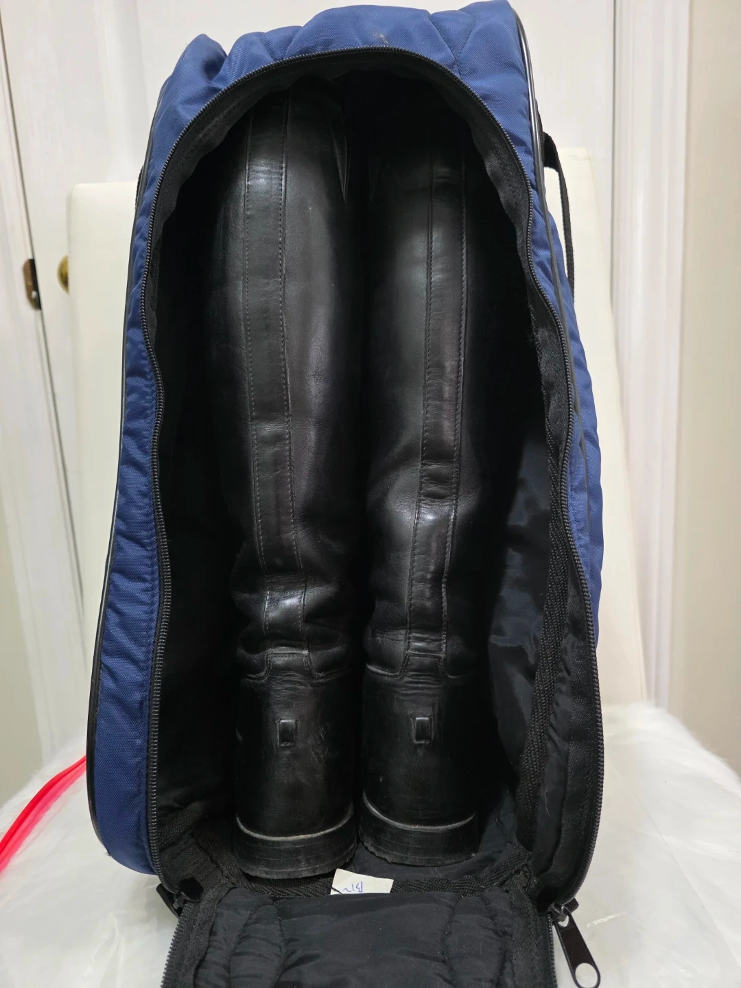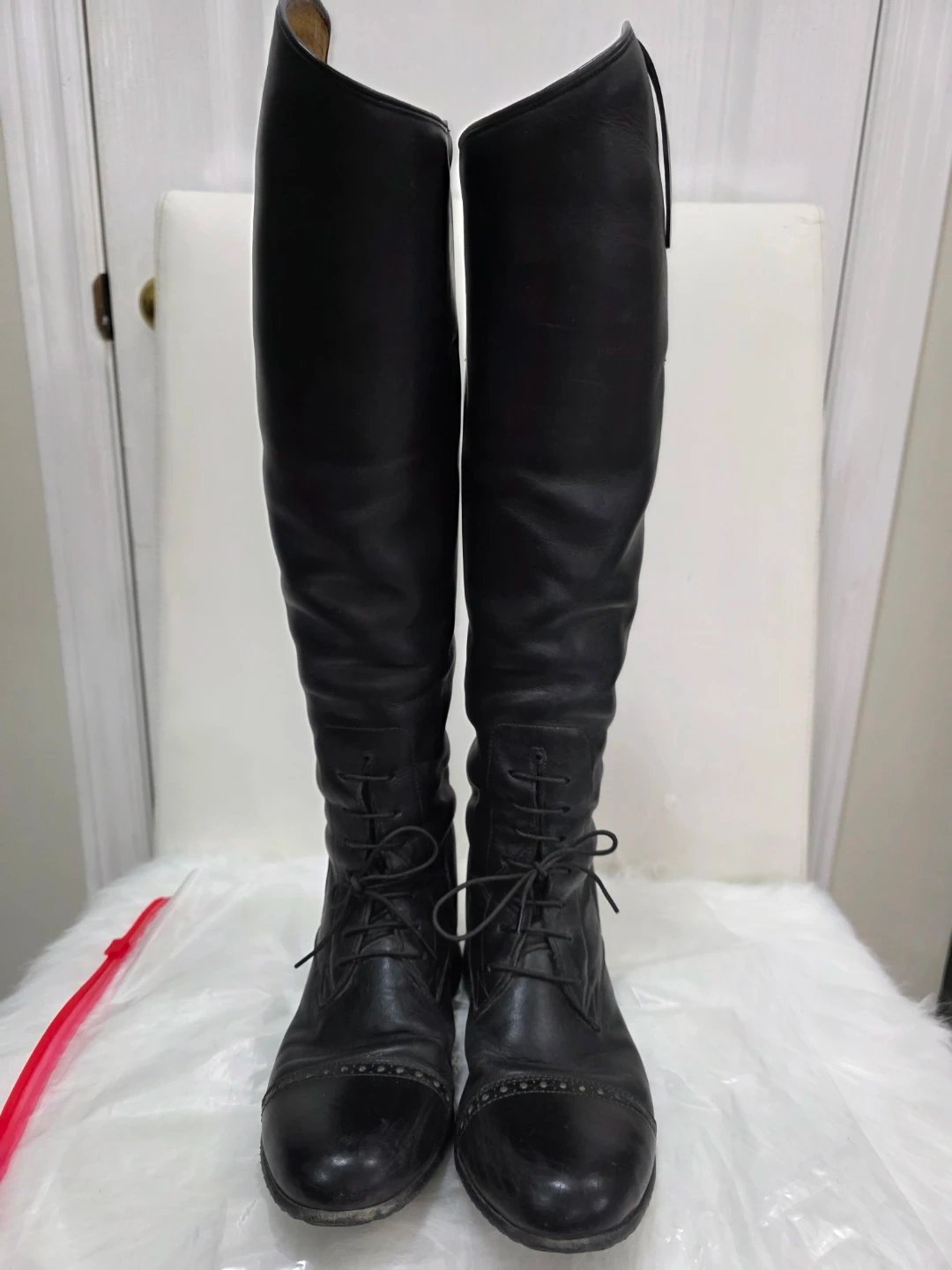 Black leather The Elite tall riding boots. These boots are made from leather with lace-up fronts, pull ups and rubber soles. Very comfortable. They're great for equestrian activities. Comes with blue boot bag, pulls and boot remover. All seen in pictures.