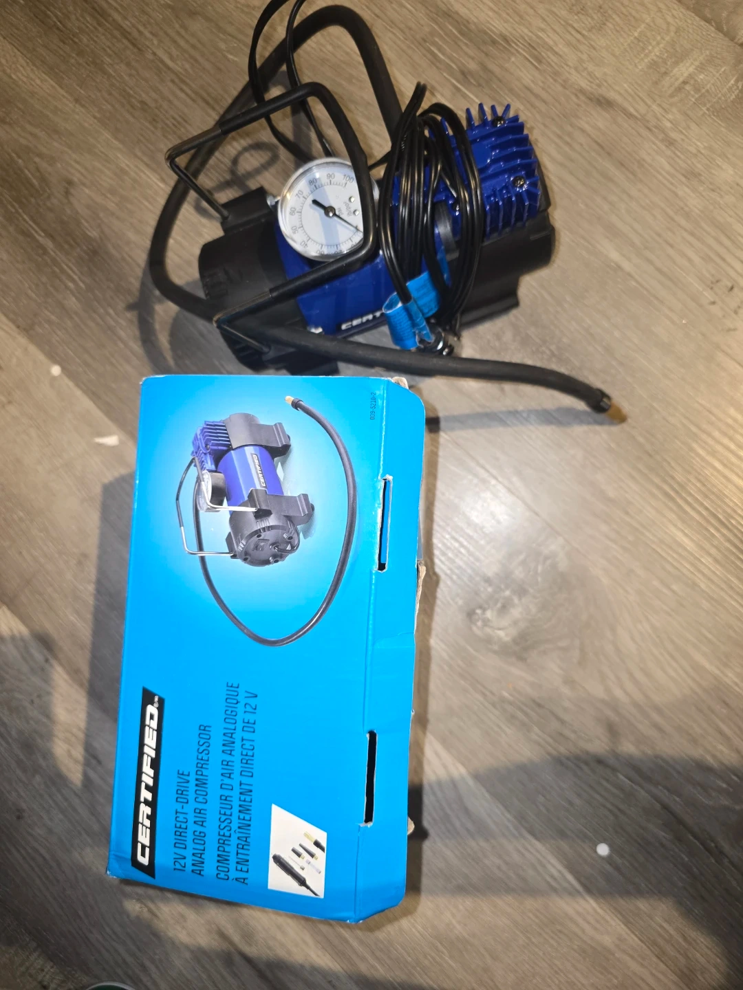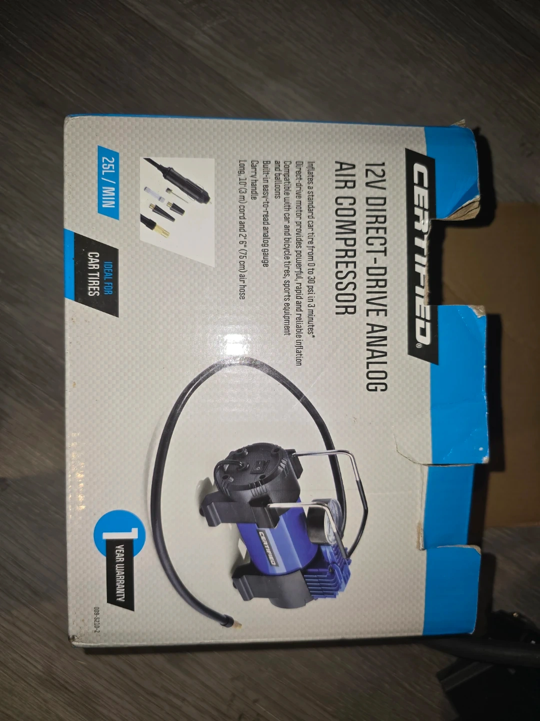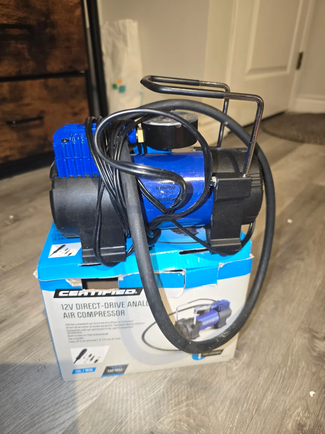 This Certified 12V direct-drive analog air compressor inflates a standard car tire from 0 to 30 PSI in 10 minutes. It features a built-in easy-to-read analog gauge and a 10 ft. air hose. It's ideal for car tires, sport equipment, and bicycle tires.