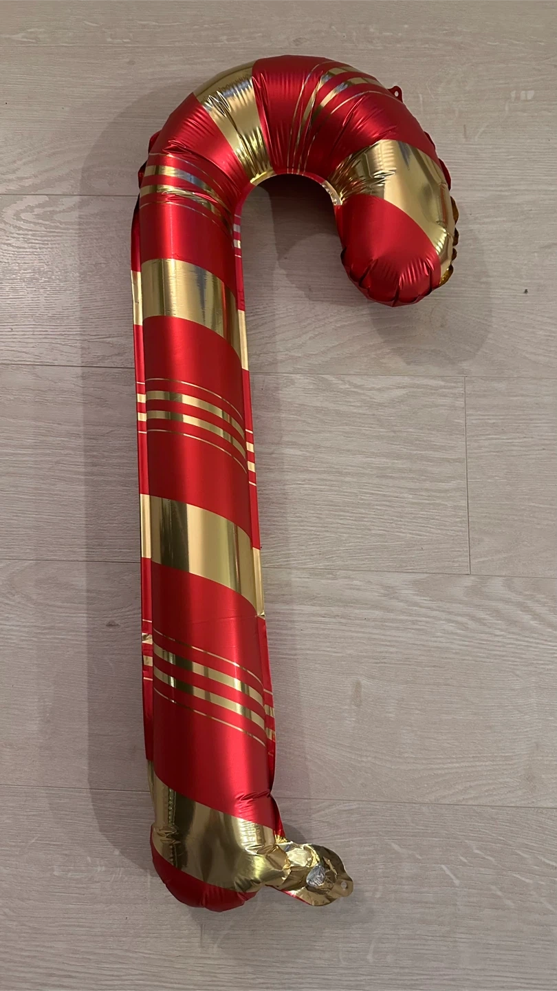 Festive candy cane balloon in red and gold! Perfect for holiday decorations or parties. It's in great shape and ready to bring some cheer to your home