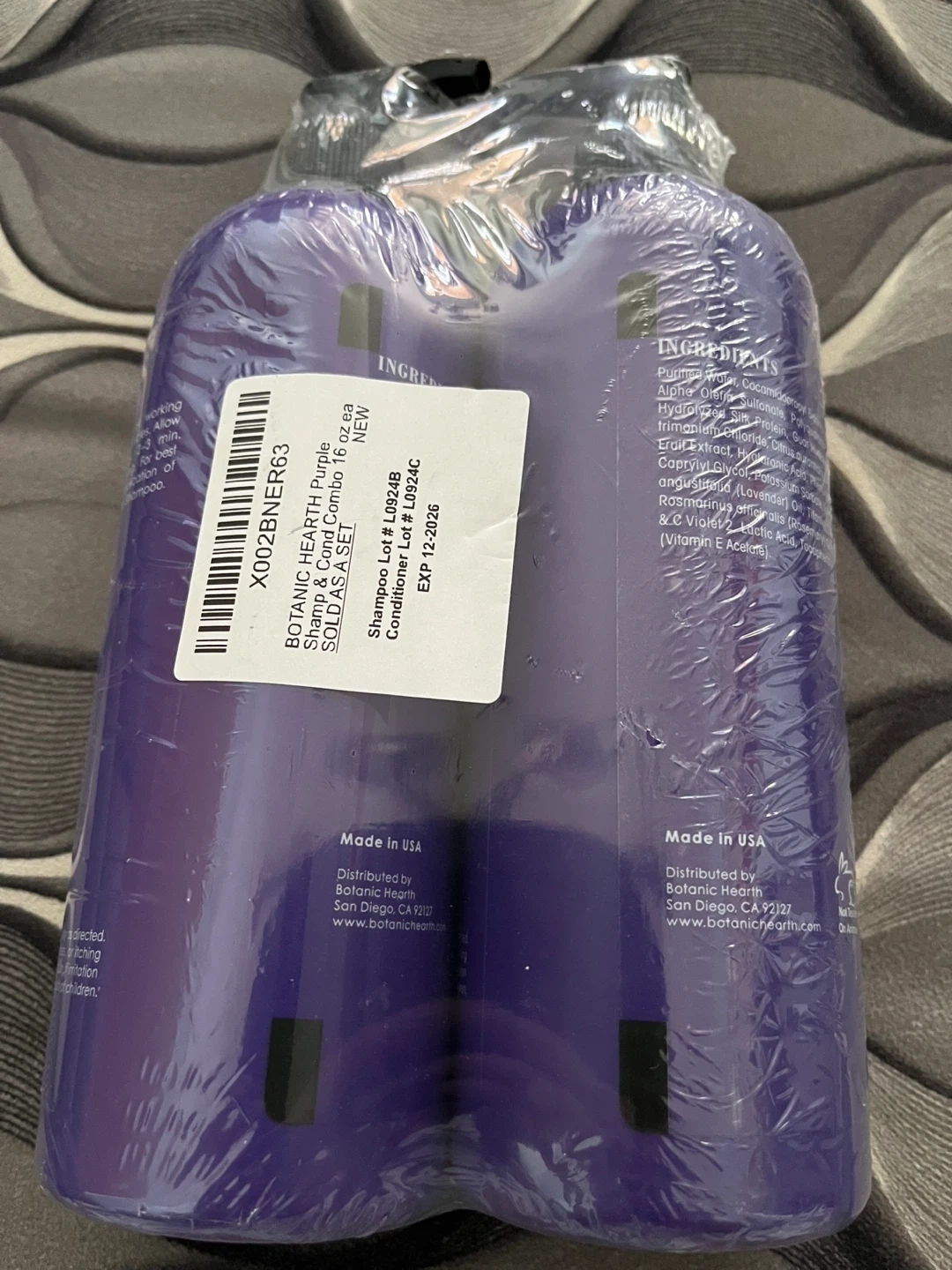 Biotanic Hearth Purple Shampoo and Conditioner set for blonde and silver hair. Each bottle is 16 fl. oz. (473 ml). Shampoo includes lavender oil, vitamin E, and rosemary oil. Conditioner contains coconut oil, bitter orange, green tea, and aloe vera. Both are sulfate-free and paraben-free.