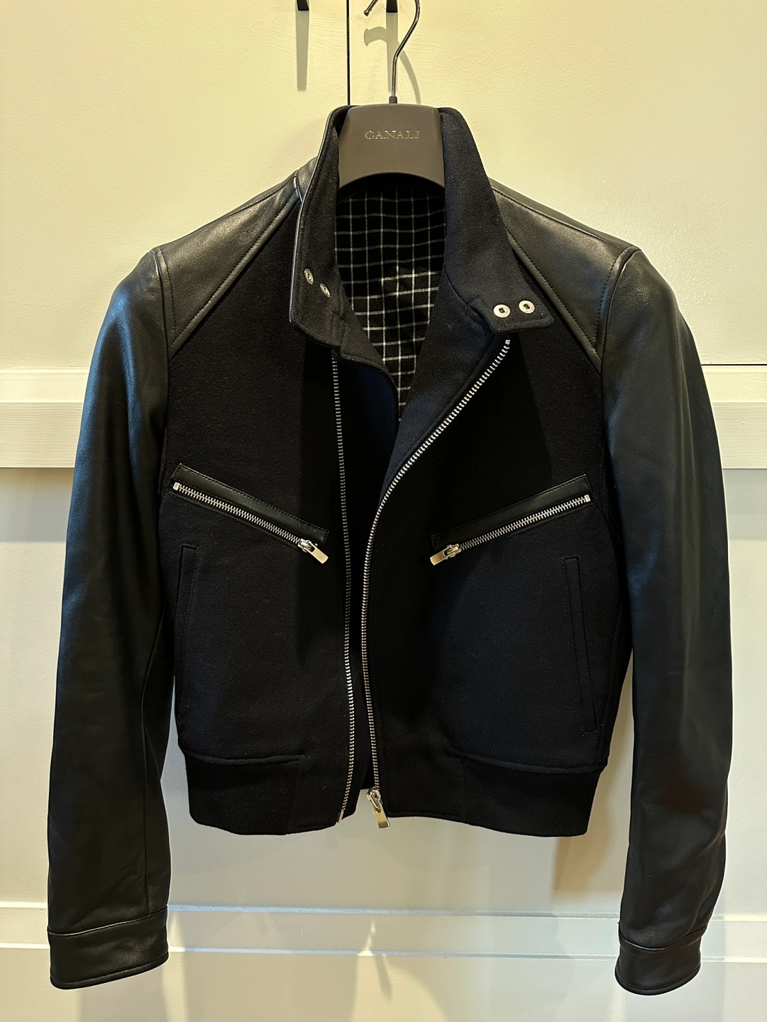 A black faux leather sleeve and wool bomber jacket by The Kooples. Features a faux leather collar, zipper closure, two front pockets, and faux leather sleeves.