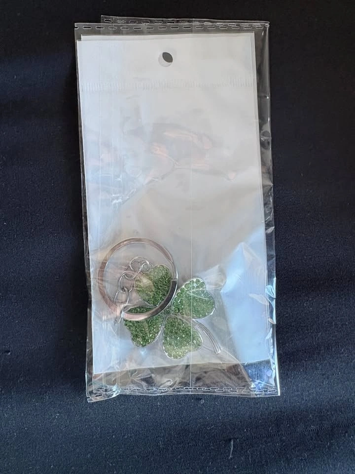Green clover keychain with sparkly crystal detail. Looks great on keys, bags, or backpacks and makes a nice lucky charm. Lightweight, eye-catching, and easy to carry. Great little gift or everyday accessory.