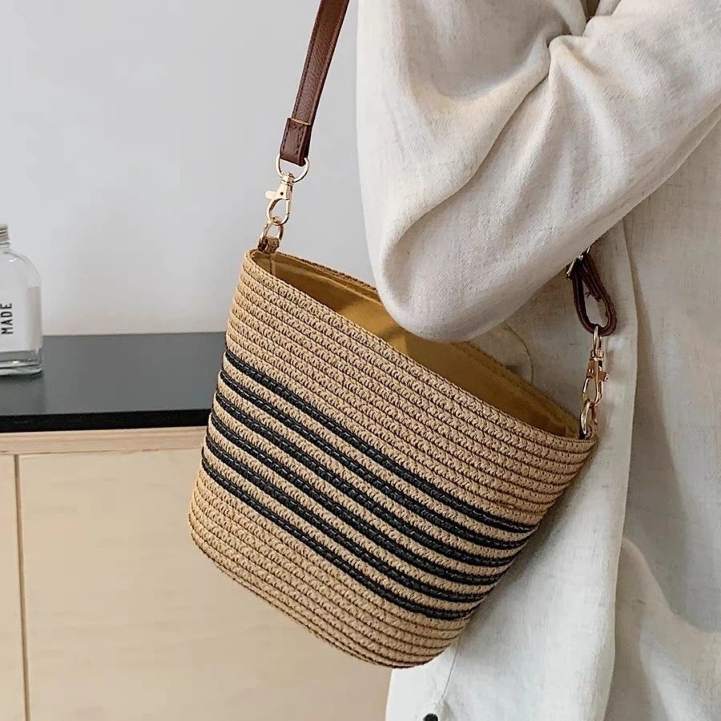Straw bucket bag with black horizontal stripes. It has a tan straw body and a brown strap. Measures approximately 7" tall and 5" in diameter.