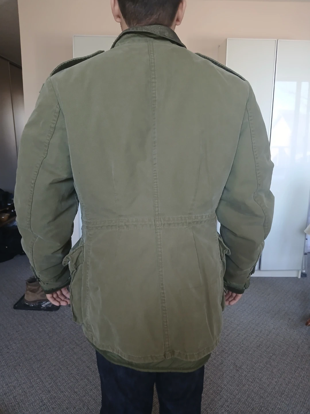 Olive green military-style parka jacket. Features a button-up front with a zip closure underneath. Multiple flap pockets on the front. Ribbed cuffs for warmth. Great for cold weather protection!