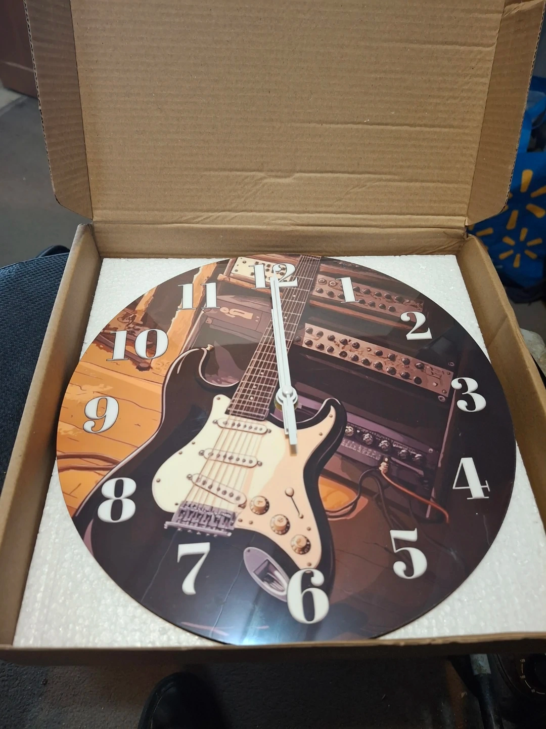 A decorative wall clock featuring an electric guitar and amplifier design. It's a fun addition for any music enthusiast's space. This clock would be great for a bedroom, den, or music room.