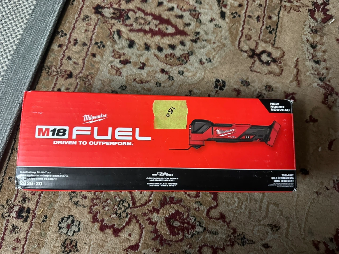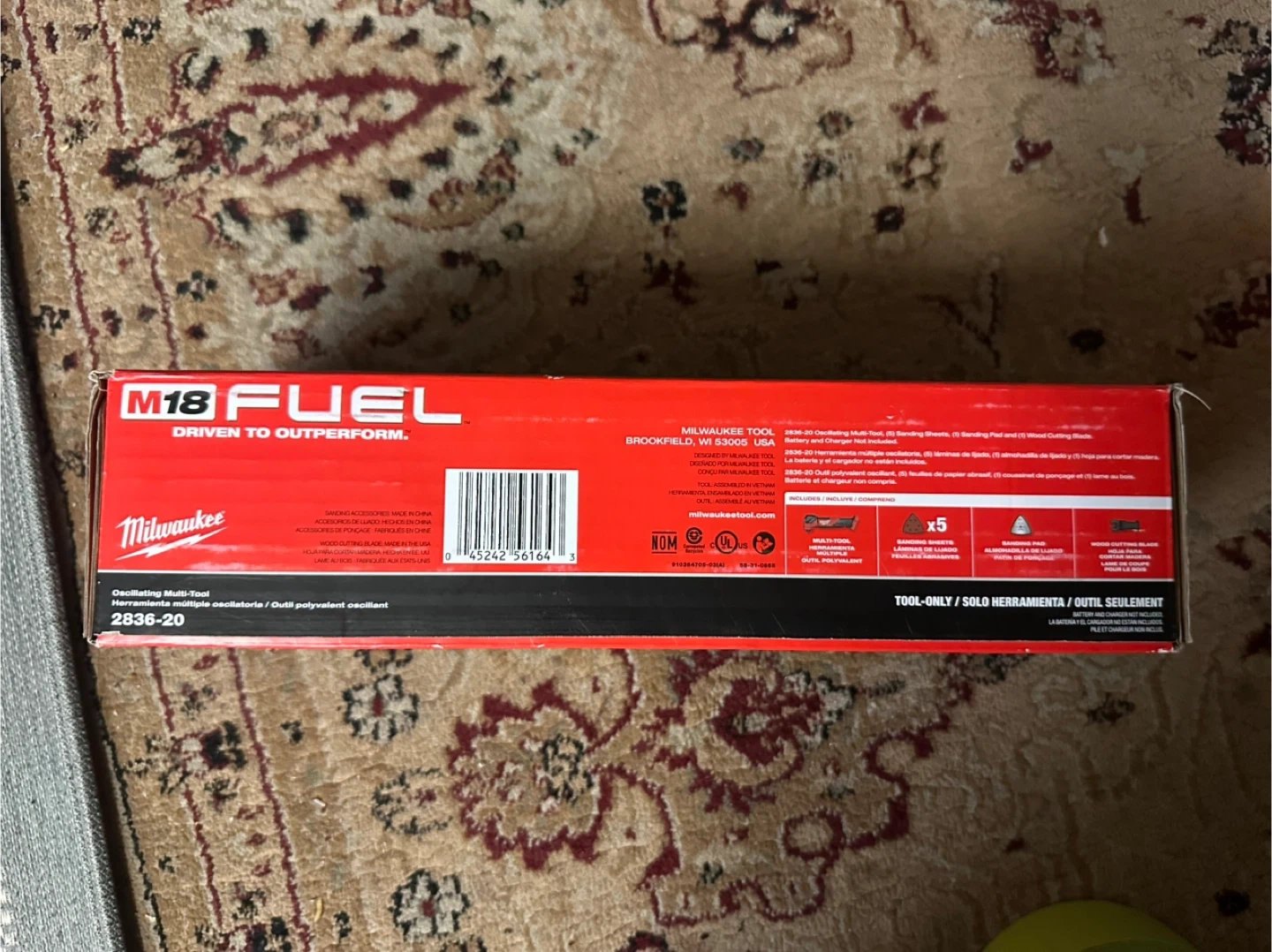 This is a Milwaukee M18 FUEL oscillating multi-tool. It's designed for high performance and low vibration. The tool comes with various accessories, including a wood cutting blade and sanding pads.