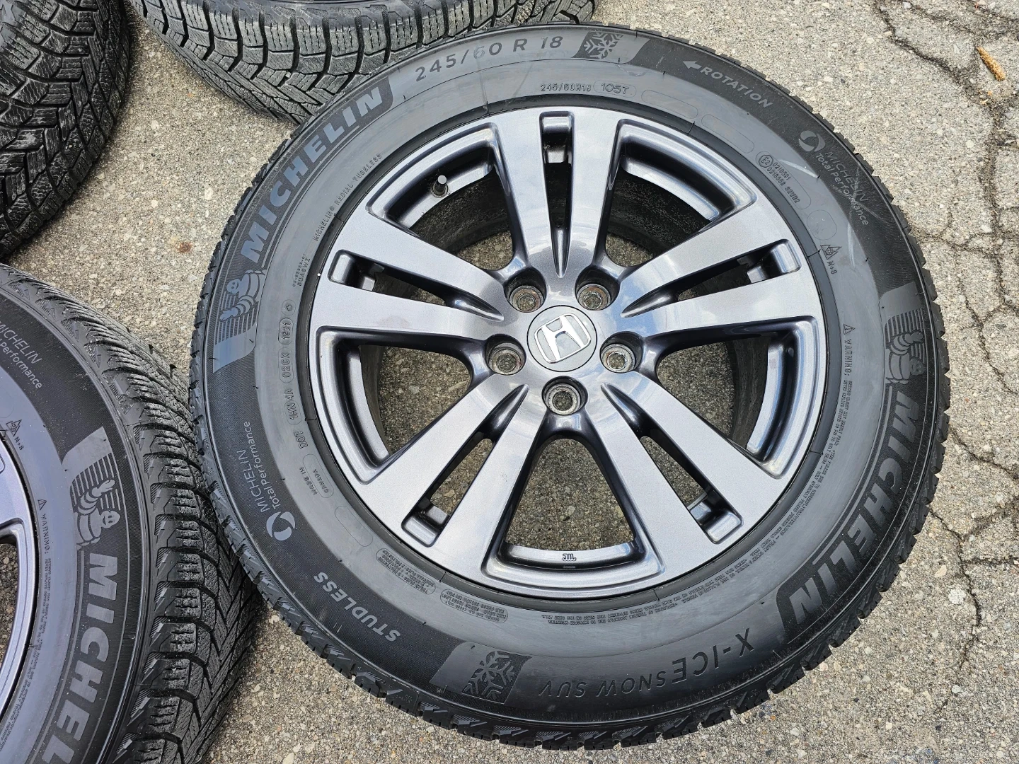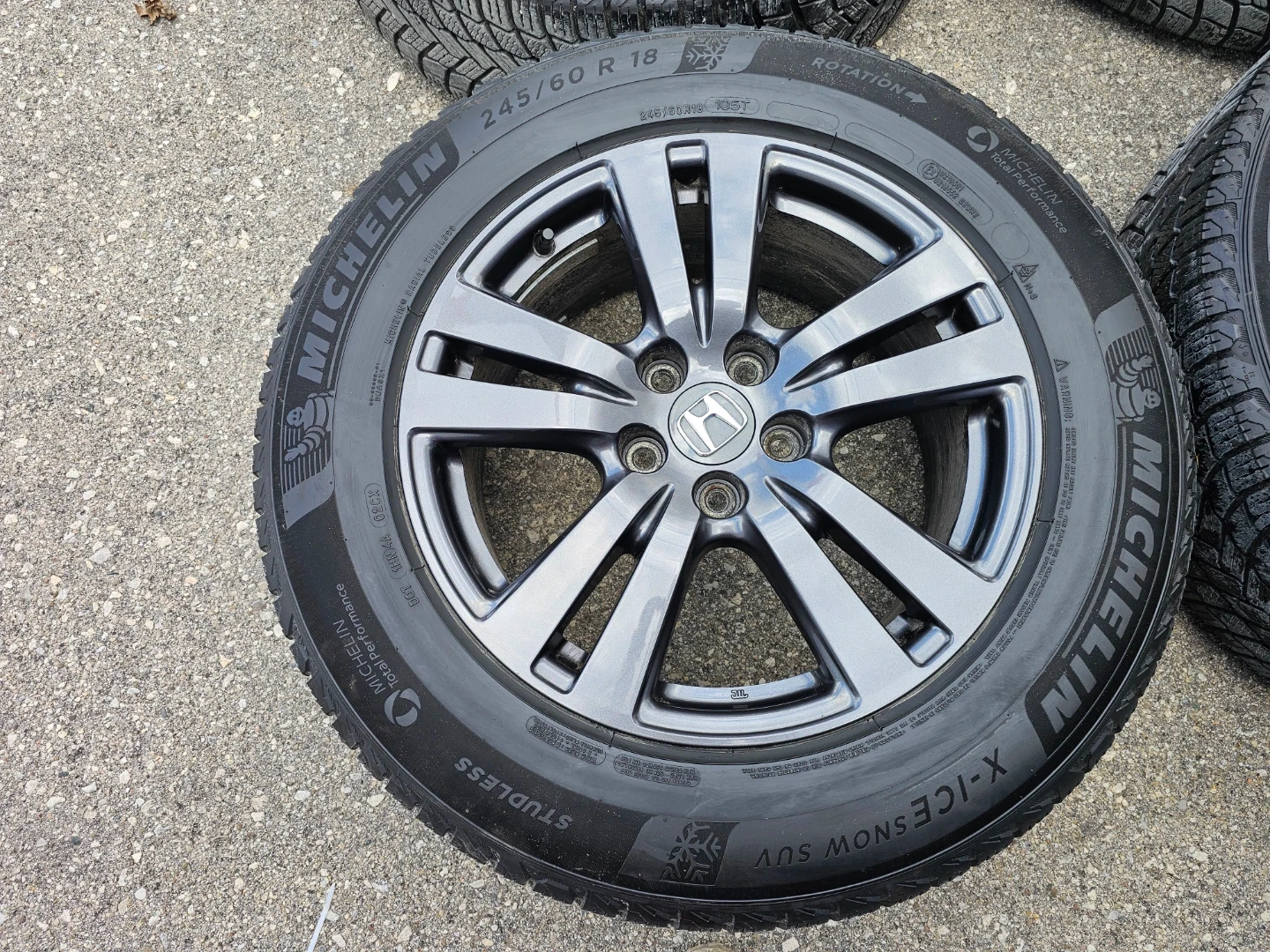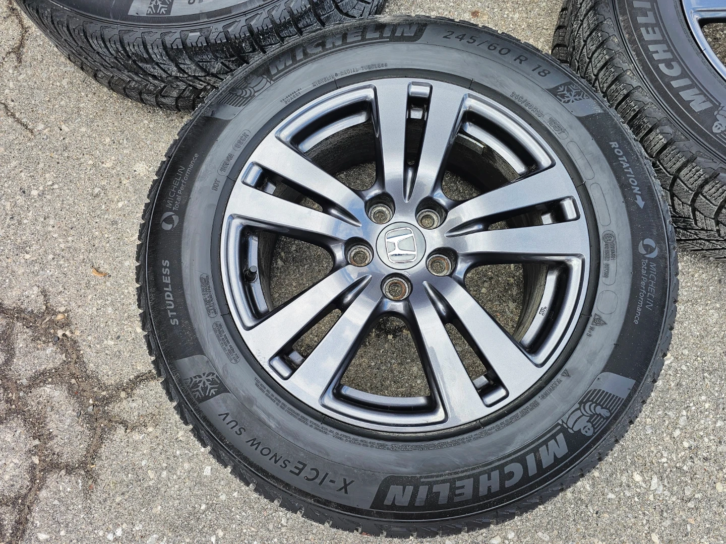 Set of 4 original 18" Honda pilot/passport rims and Michellin X-ICE winter tires 245/60 R18. Rims and tires are in good shape, no damage, no cracks, no bend. Lots of thread left on tires, TPMS installed
