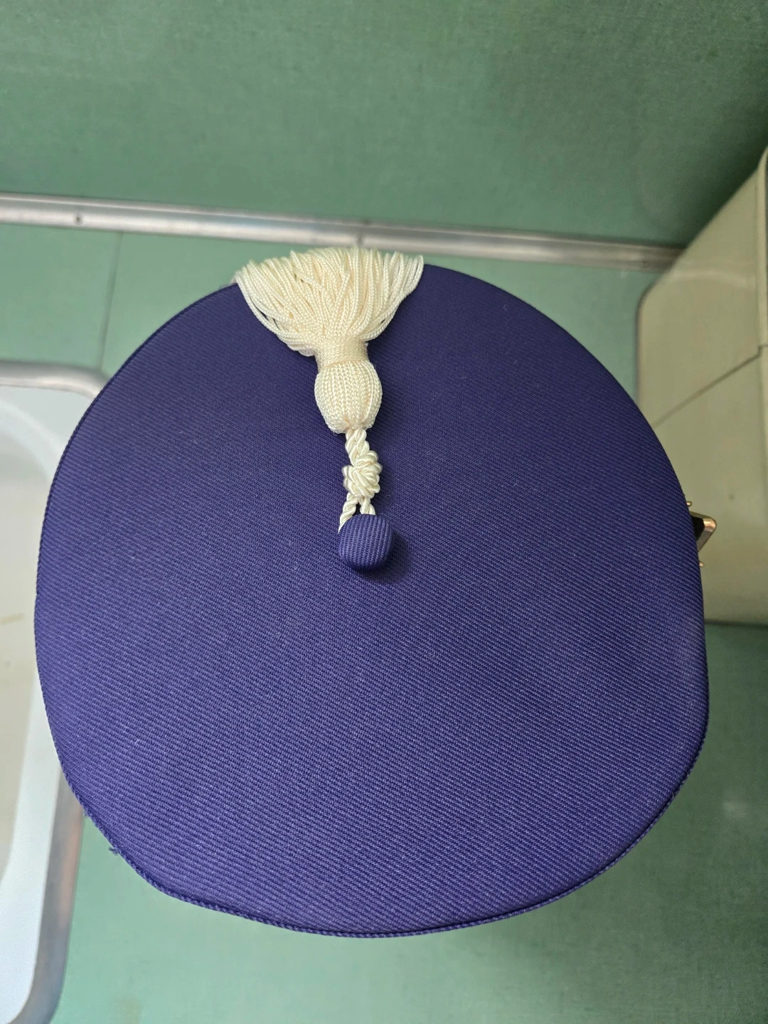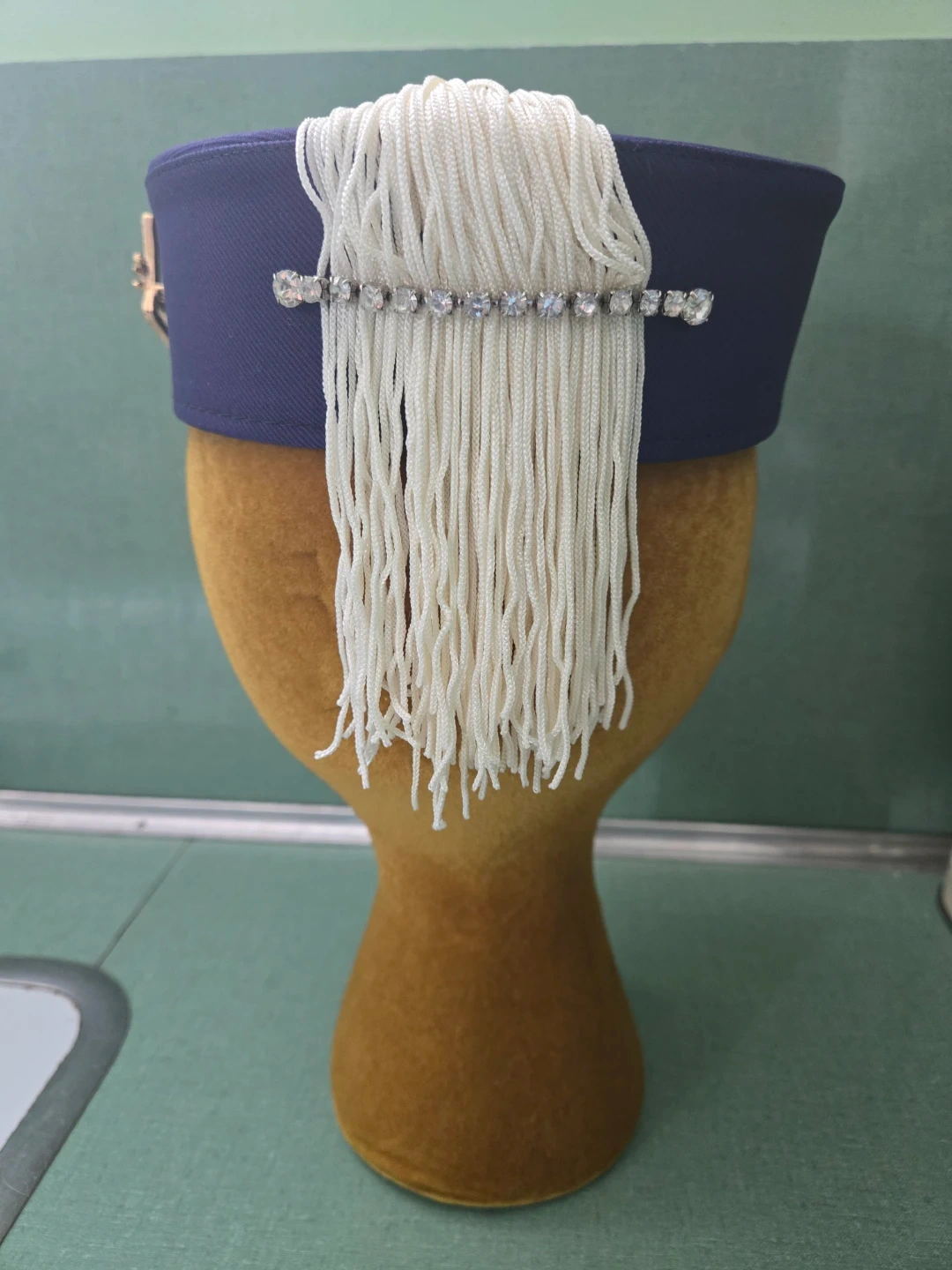 Navy with a white removable tassel fastened with a rhinestone clip