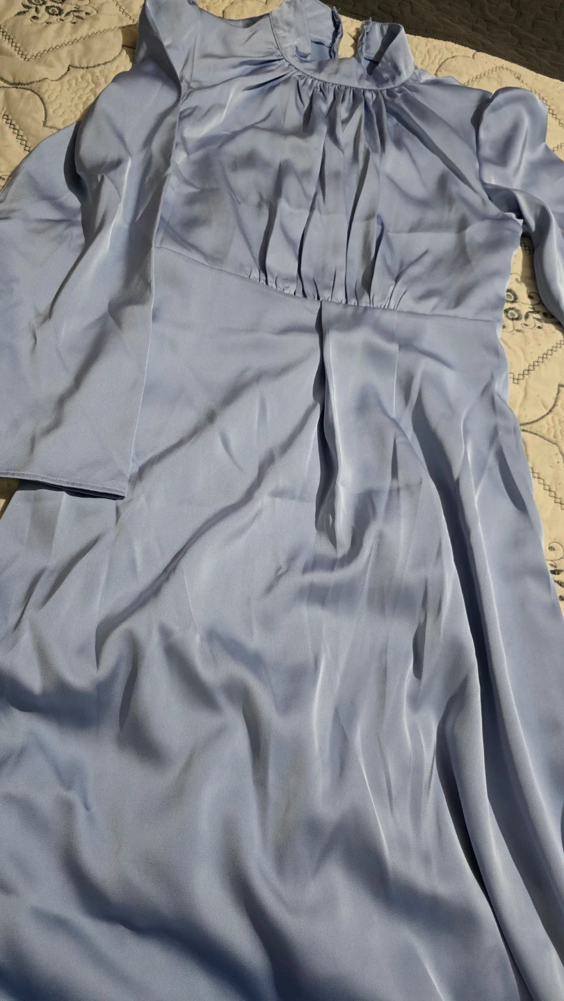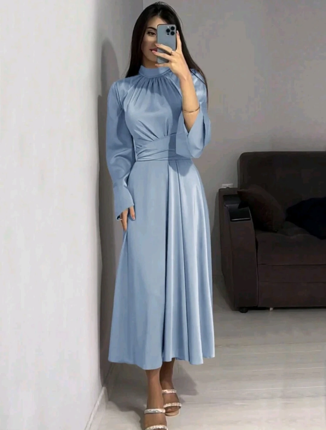 This elegant blue dress features a satin-like material with a flattering ruched neckline and a tie-back waist. It has long bell sleeves and a flowy A-line skirt. It's suitable for a dressy occasion or a sophisticated look.