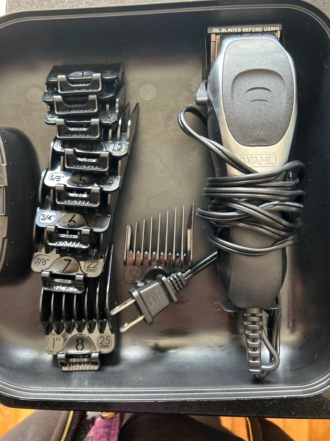 This WAHL grooming kit includes a corded hair clipper and a cordless trimmer. It comes with various attachment combs for different hair lengths, scissors, and a cleaning brush. Everything is neatly stored in a durable black carrying case.