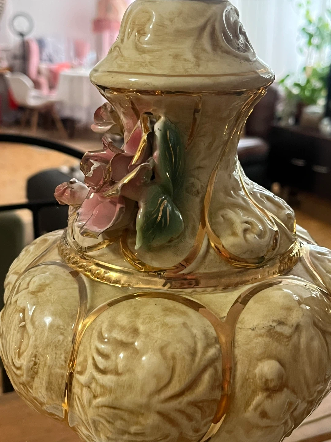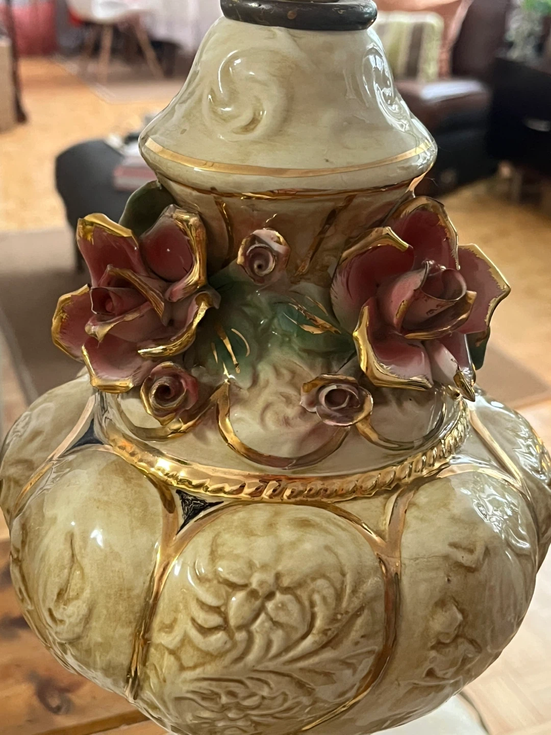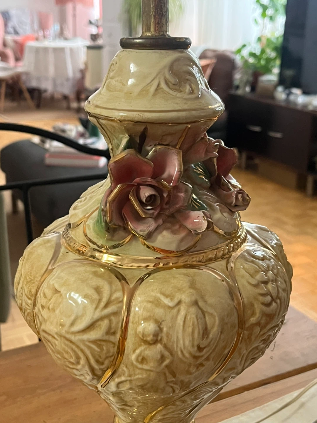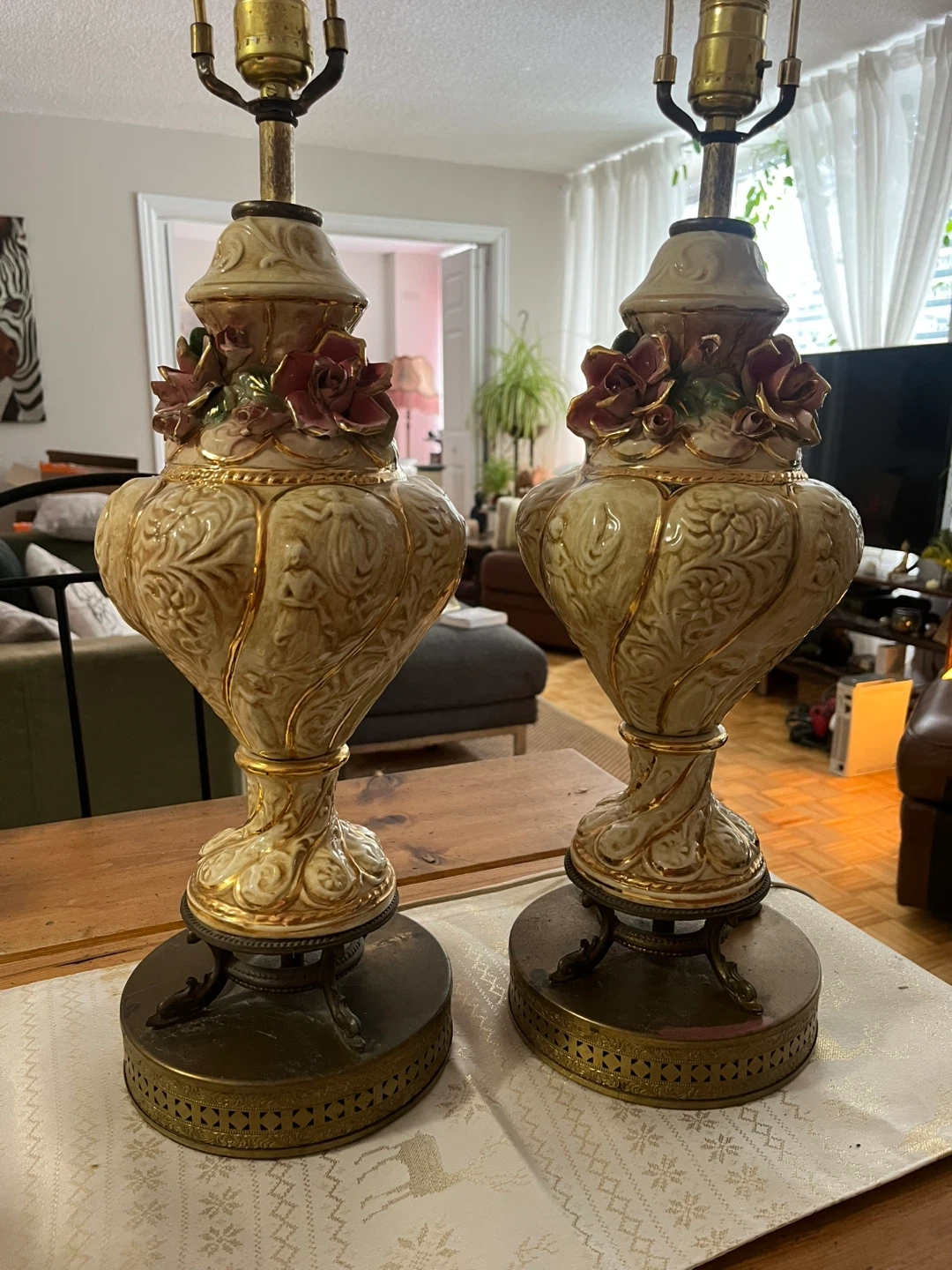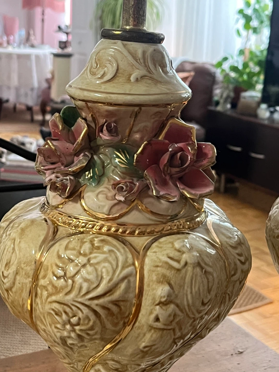 Selling a beautiful set of two antique Capodimonte style table lamps featuring detailed porcelain roses. These are classic Italian-style decorative lamps and make a stunning statement in a living room, bedroom, or traditional space.