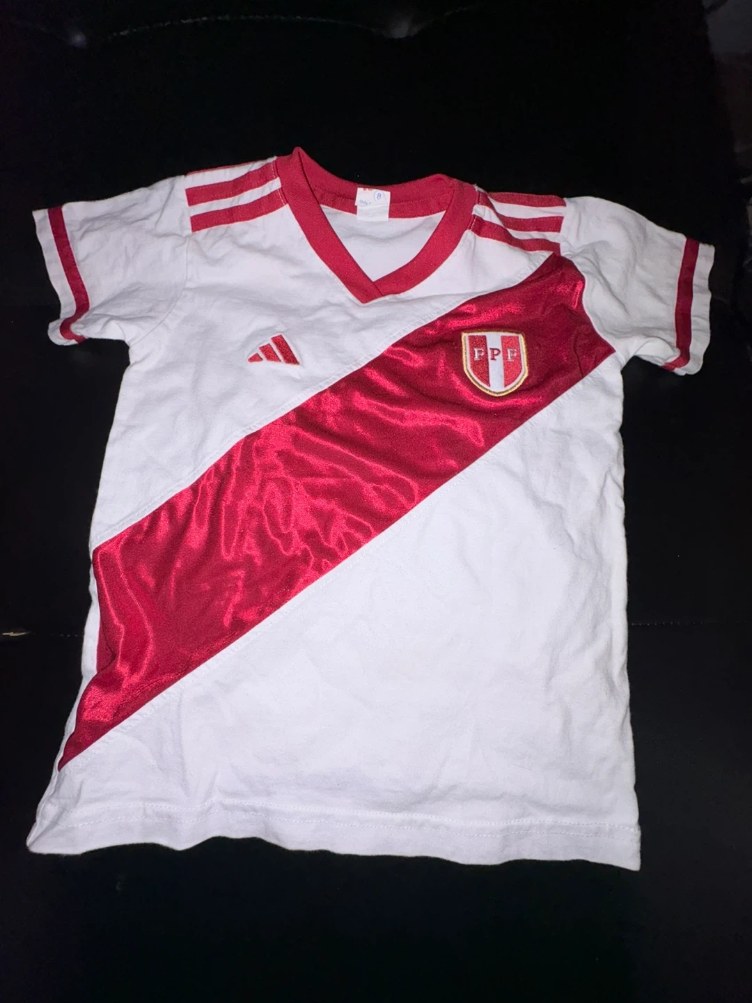 White and red soccer jersey with the Peru flag emblem. Features Adidas logo. Short sleeves and crew neck. This jersey is great for young soccer fans!