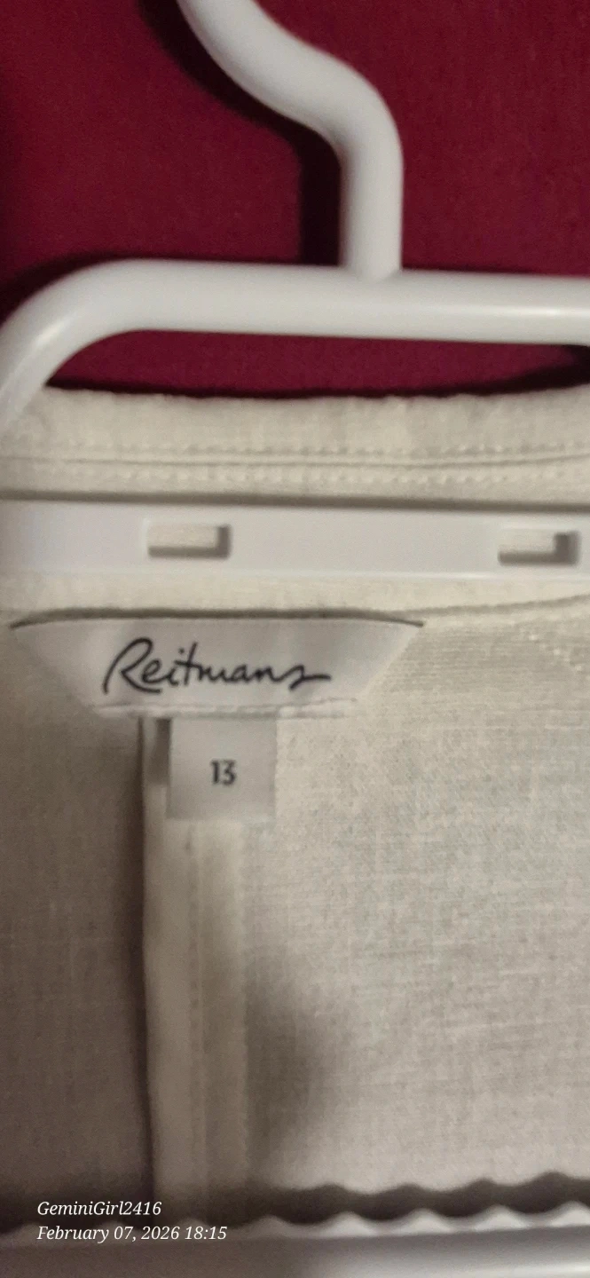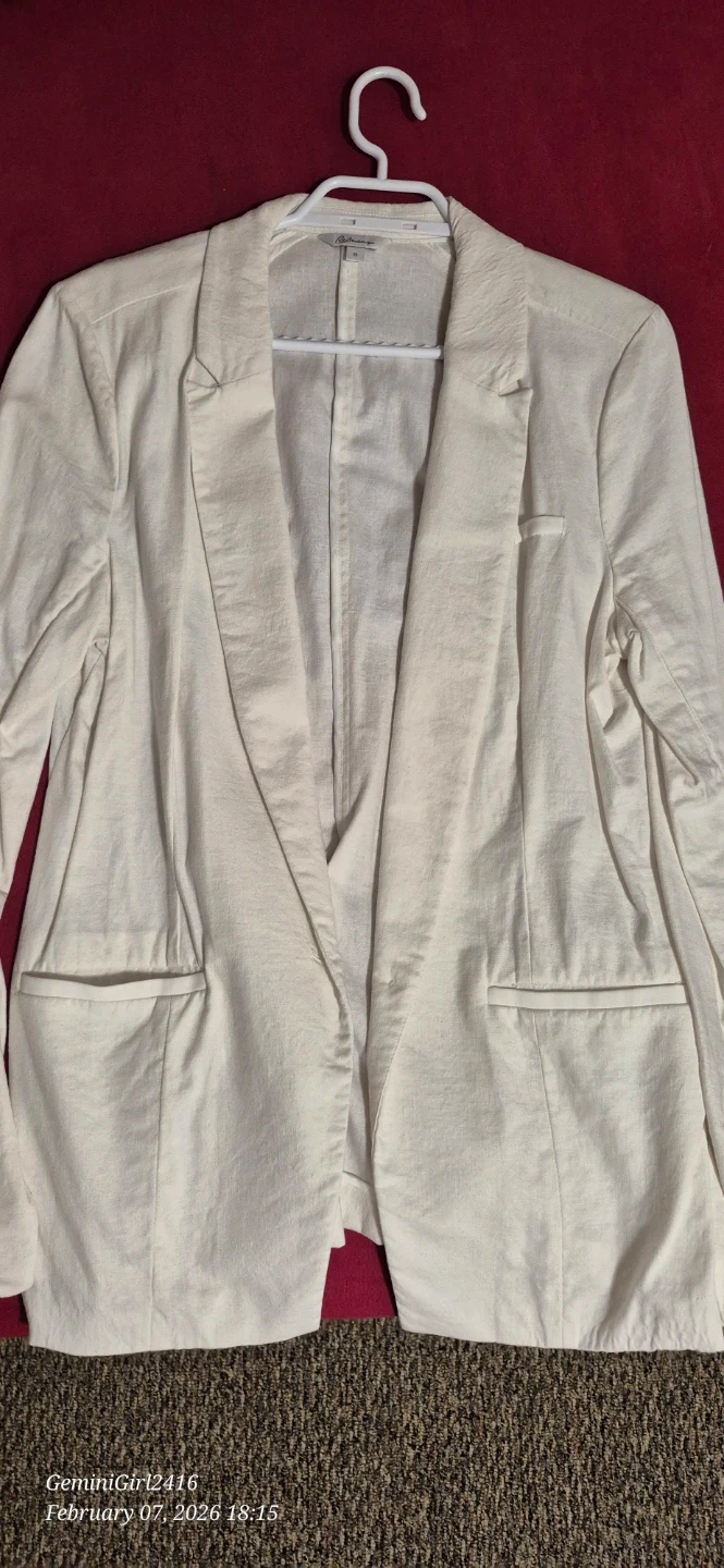 This beige Reitmans blazer is crafted from a comfortable linen blend. It features a classic notched lapel and two front pockets. Size 13.