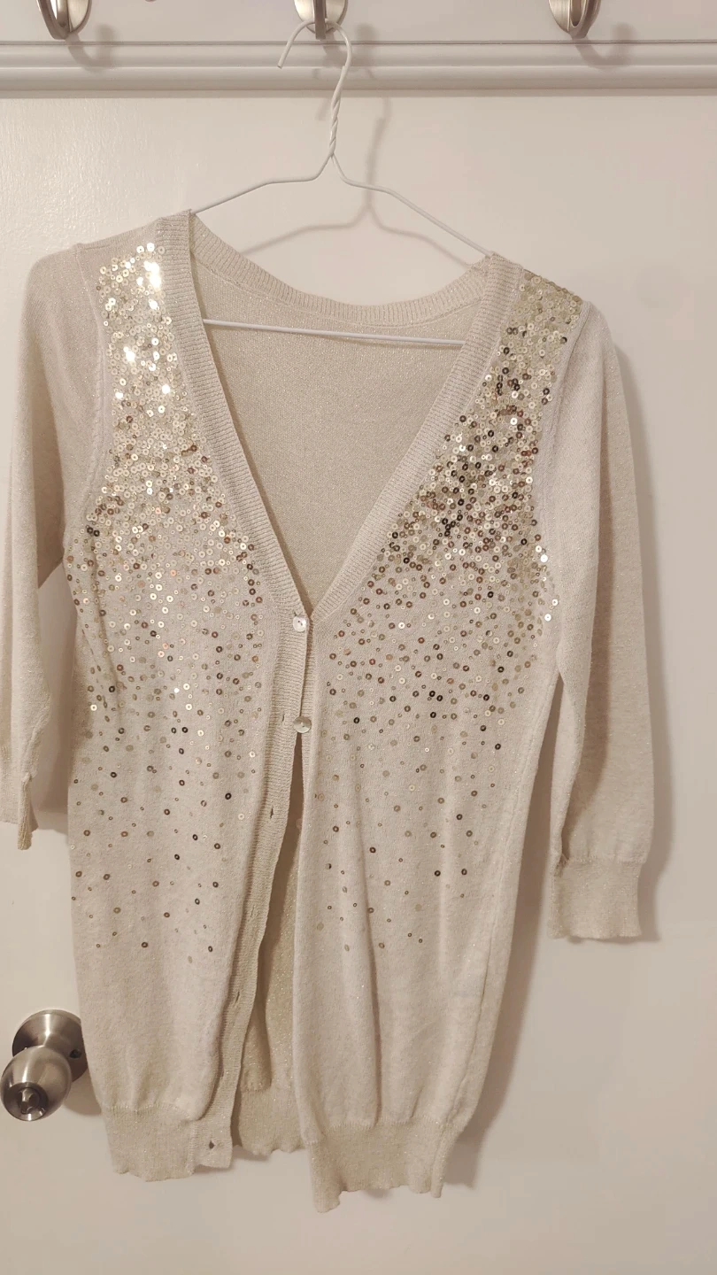 Here's a cute cardigan with sequin detailing! It's perfect for adding a bit of sparkle to your outfit. This is a great layering piece for any season