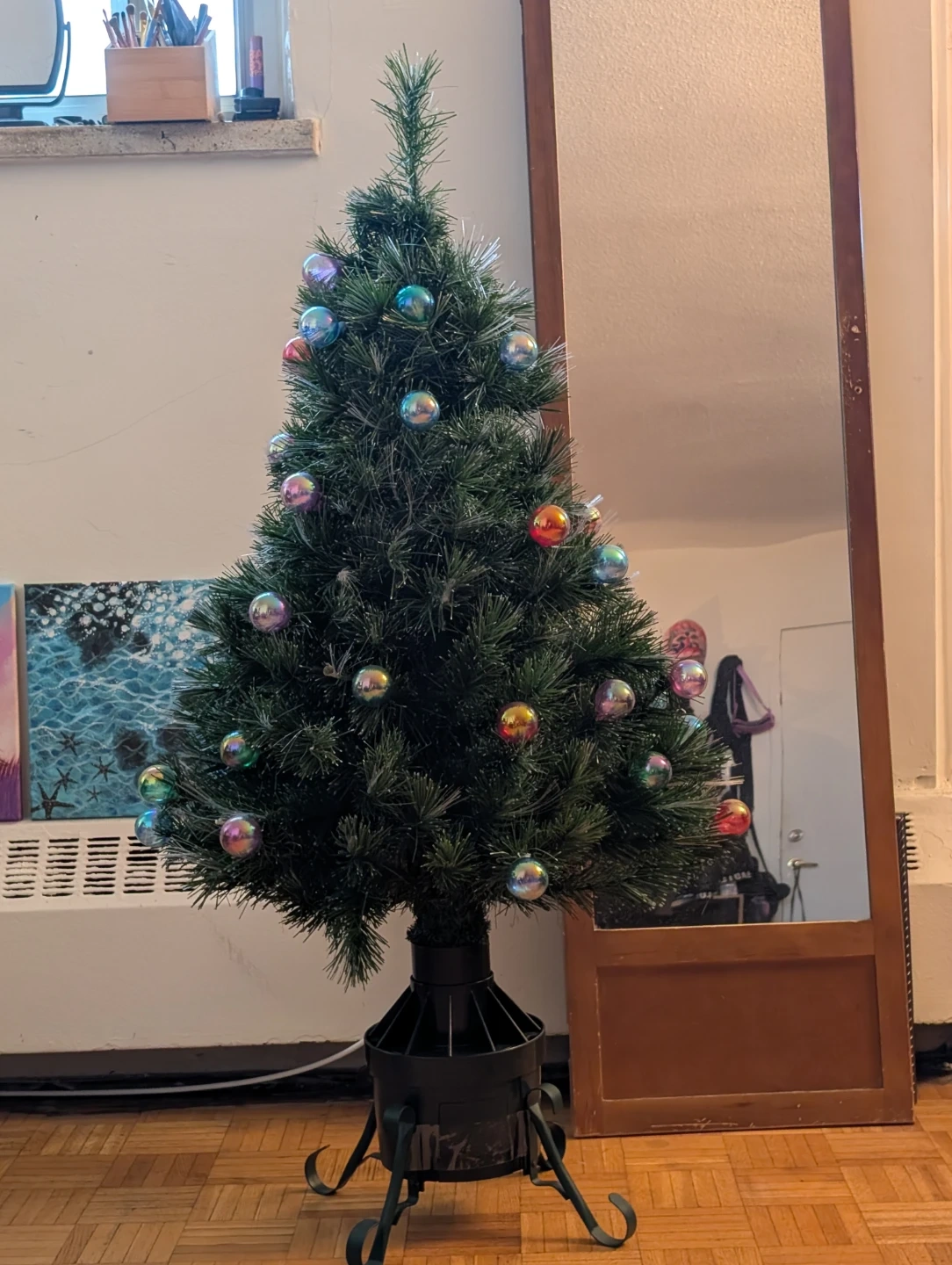 This is a pre-lit artificial Christmas tree. It comes with colourful iridescent ornaments. It's perfect for a small space or as a secondary tree for holiday decorations!