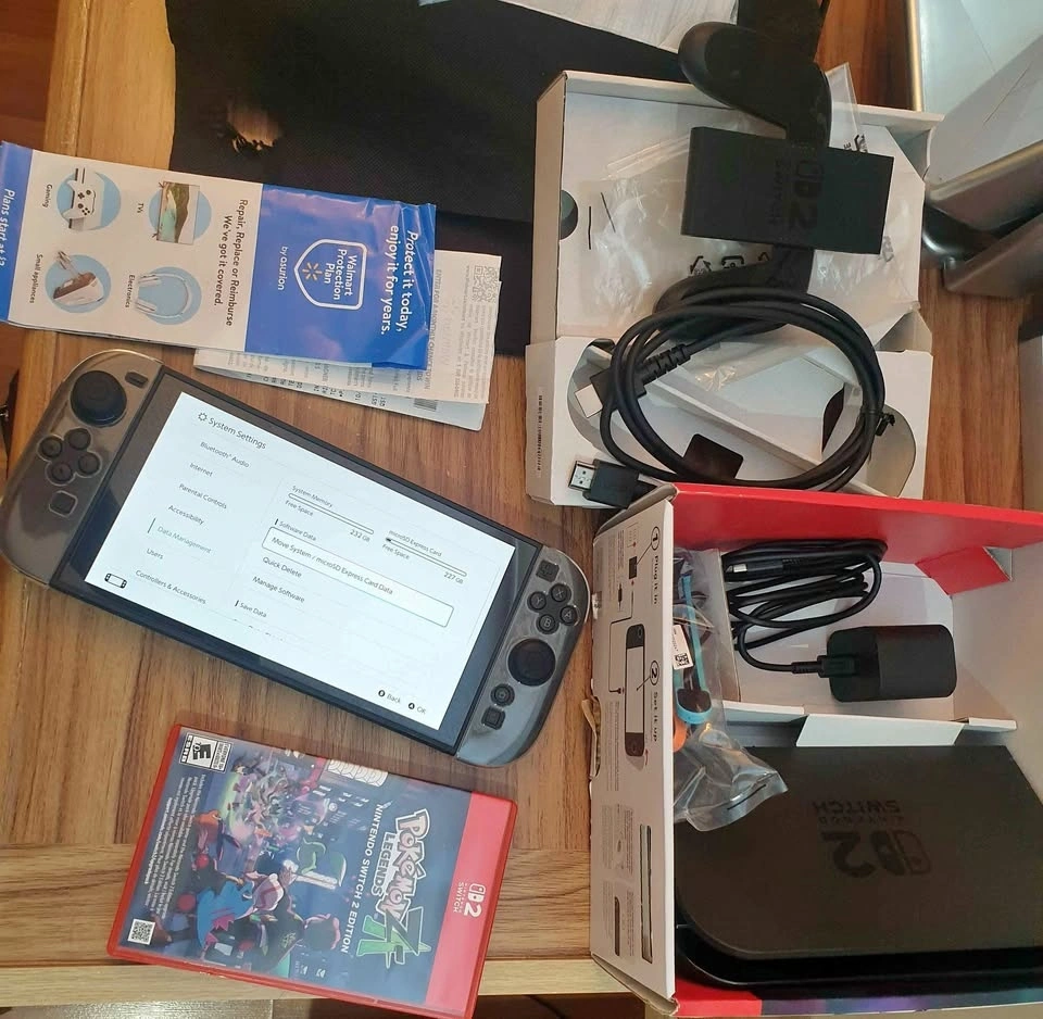 Complete Nintendo Switch OLED unit with original box and all accessories. Includes a Samsung 256GB microSD card, Pokémon Legends: Arceus game, screen protector (applied since day one), protective cover, thumb grips, and a carrying case. Comes with a Walmart protection plan valid until October 19, 2025. Asking $725. No trades, please.