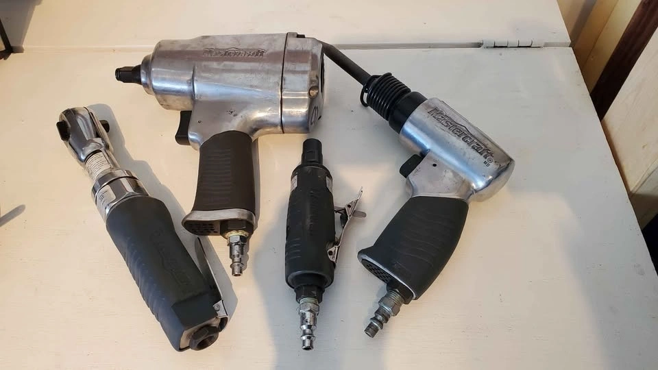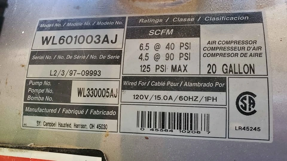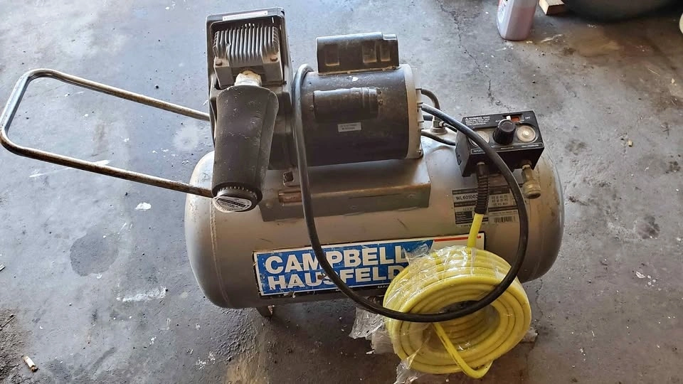 20-gallon tank, includes tools and accessories as shown in pictures. New hose on compressor, still in original packing. The switch doesn't work reliably; it stays on, so you have to remove the power cord to turn it off. Selling because I need cash to repair my van.