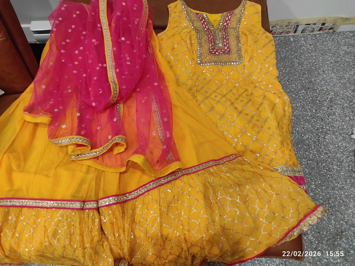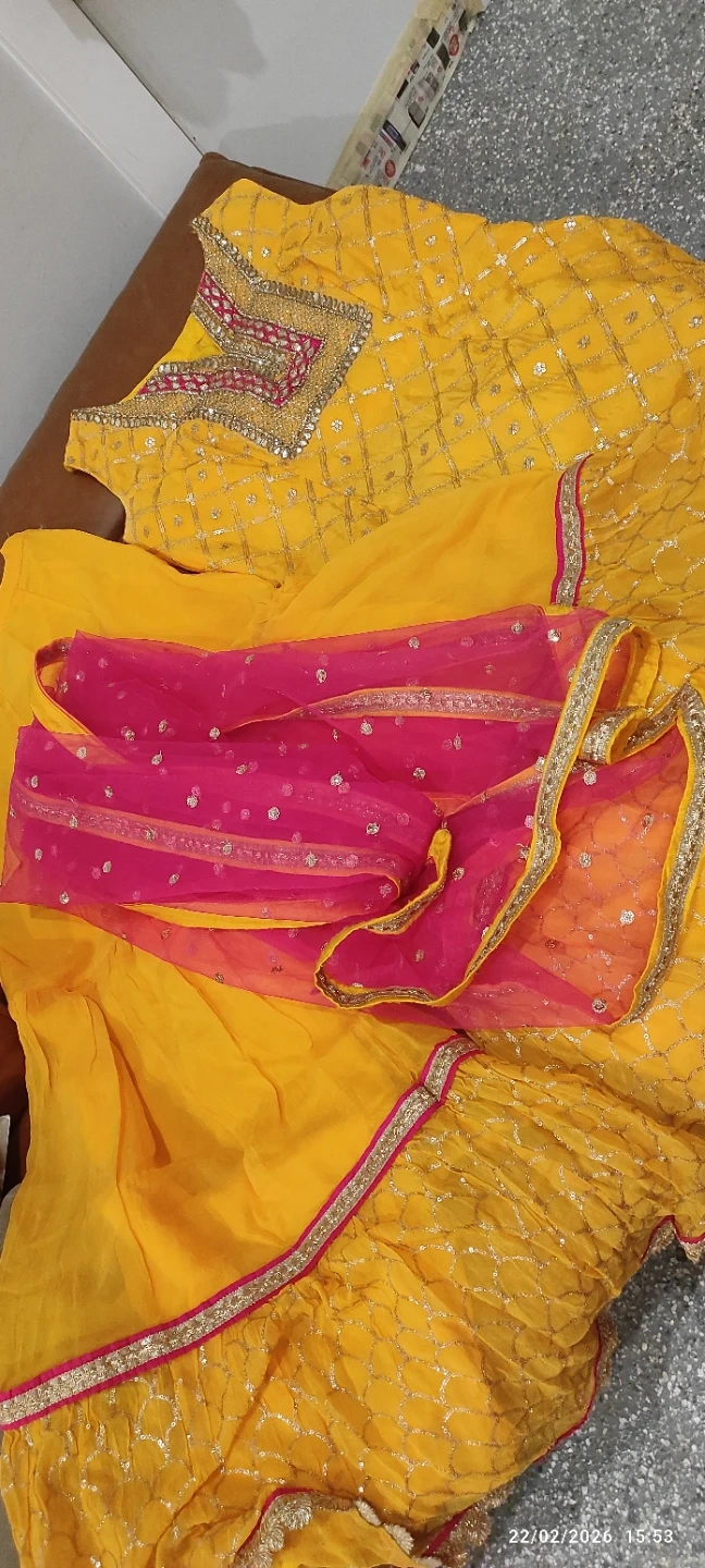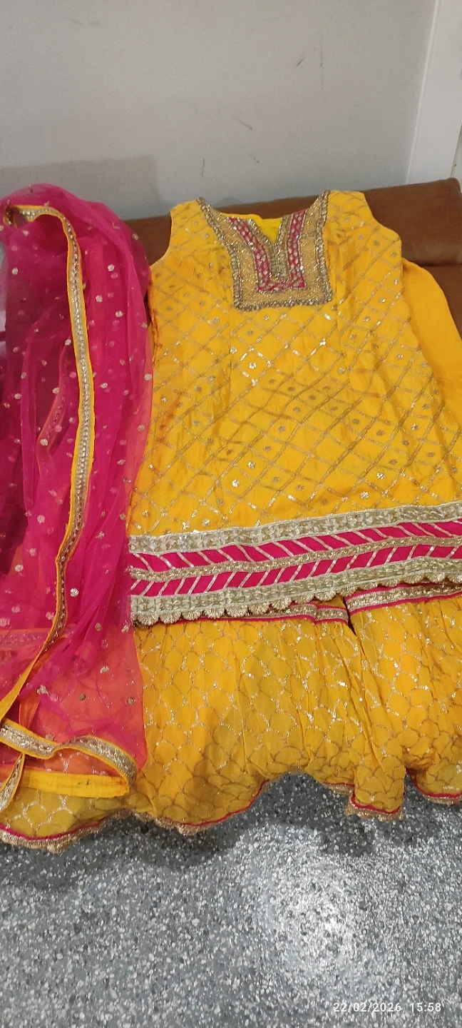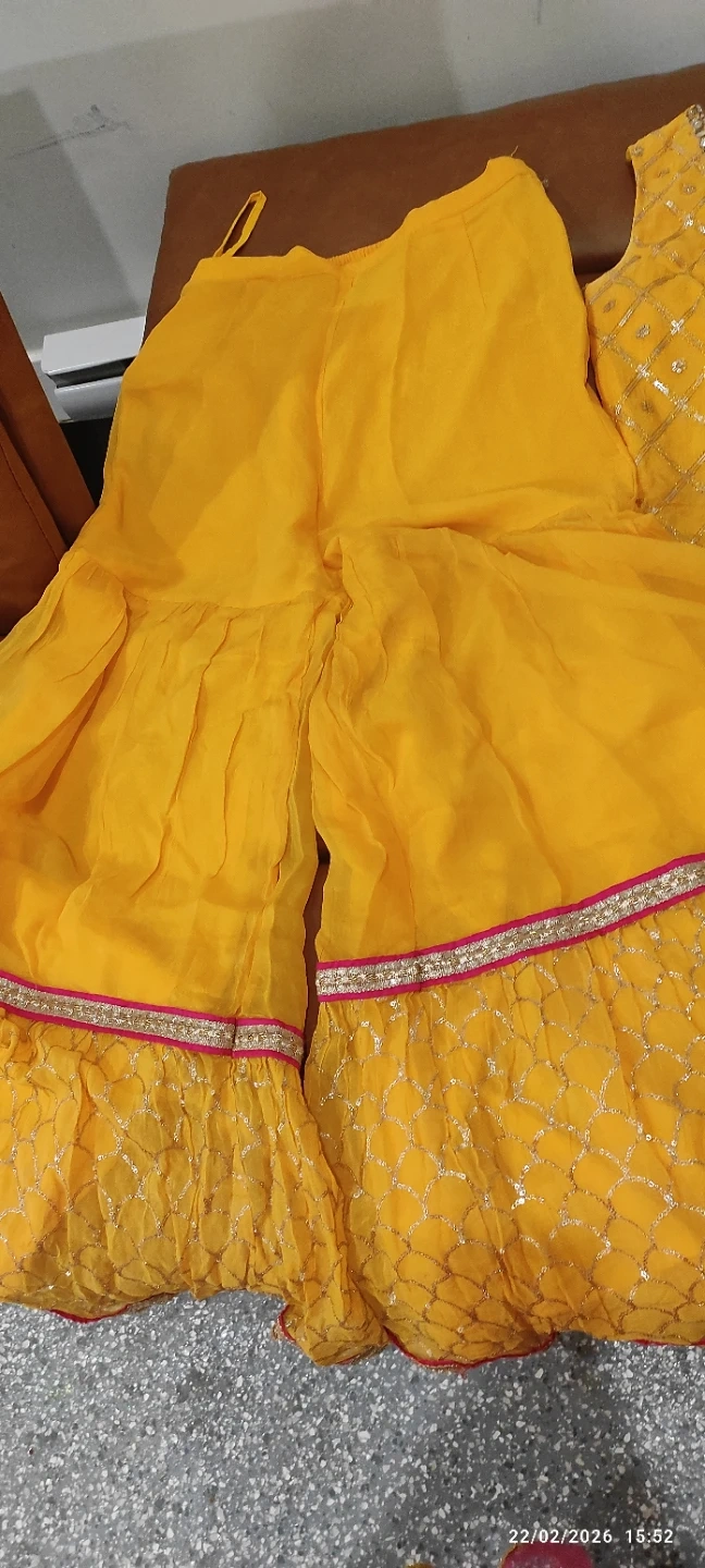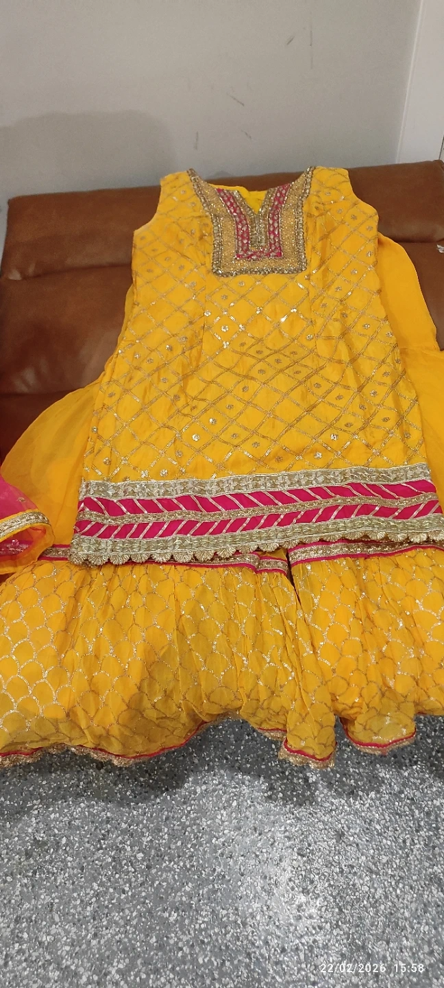 This is a bright yellow embroidered sharara suit. It includes a sleeveless kameez with intricate gold thread work and a matching sharara. A pink net dupatta with scattered sequins and gold trim completes the set. Perfect for festive occasions!