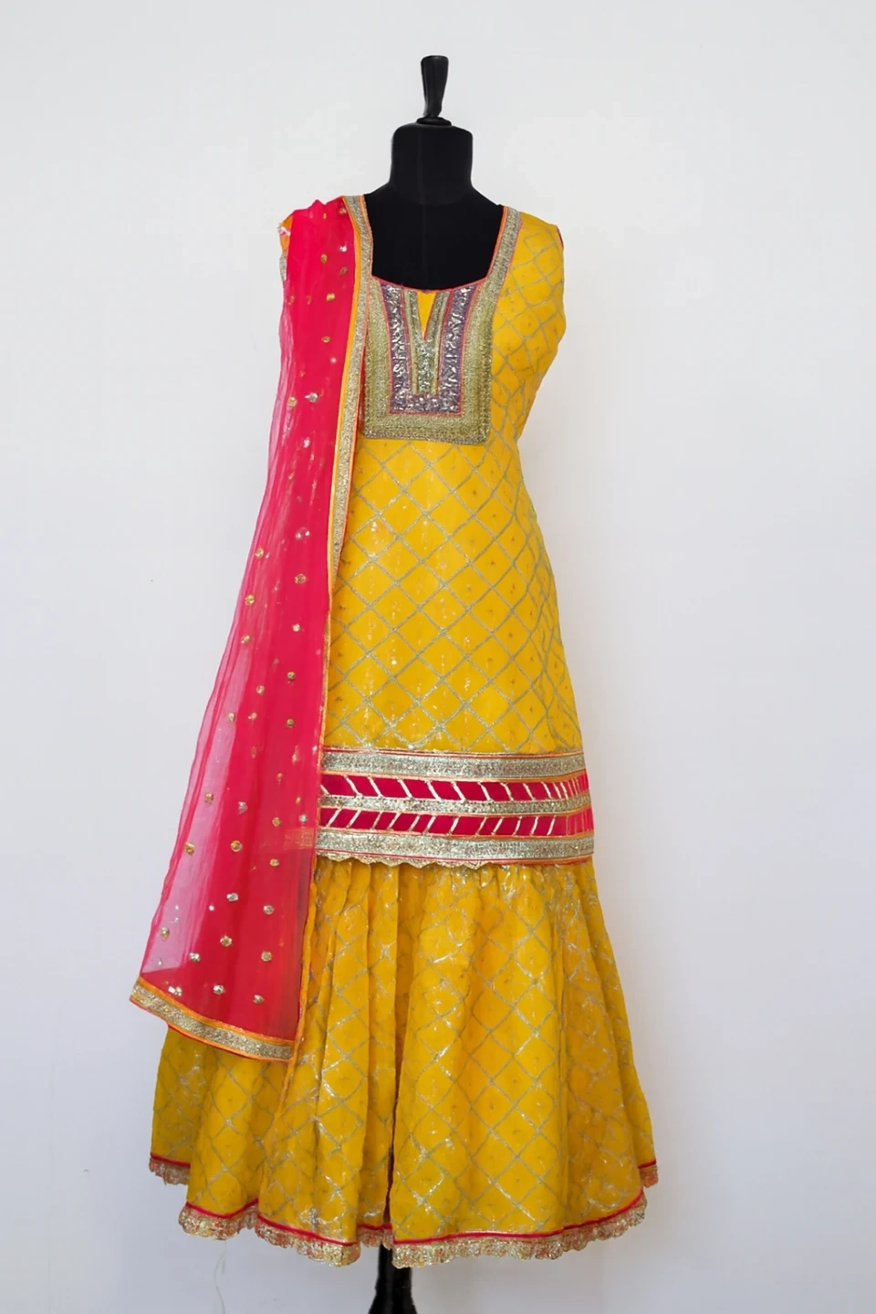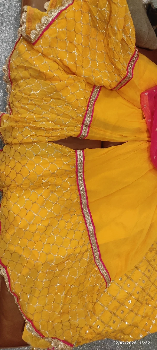 This is a bright yellow embroidered sharara suit. It includes a sleeveless kameez with intricate gold thread work and a matching sharara. A pink net dupatta with scattered sequins and gold trim completes the set. Perfect for festive occasions!
