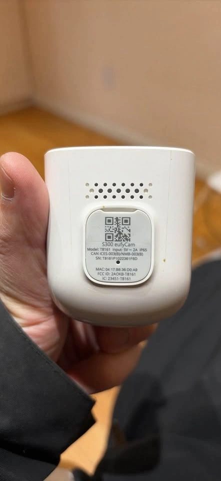High-resolution 4K wireless security camera from eufy. This S300 eufyCam model T8161 has a white and black plastic exterior. It is a compact outdoor-rated unit with a built-in spotlight and motion sensor.