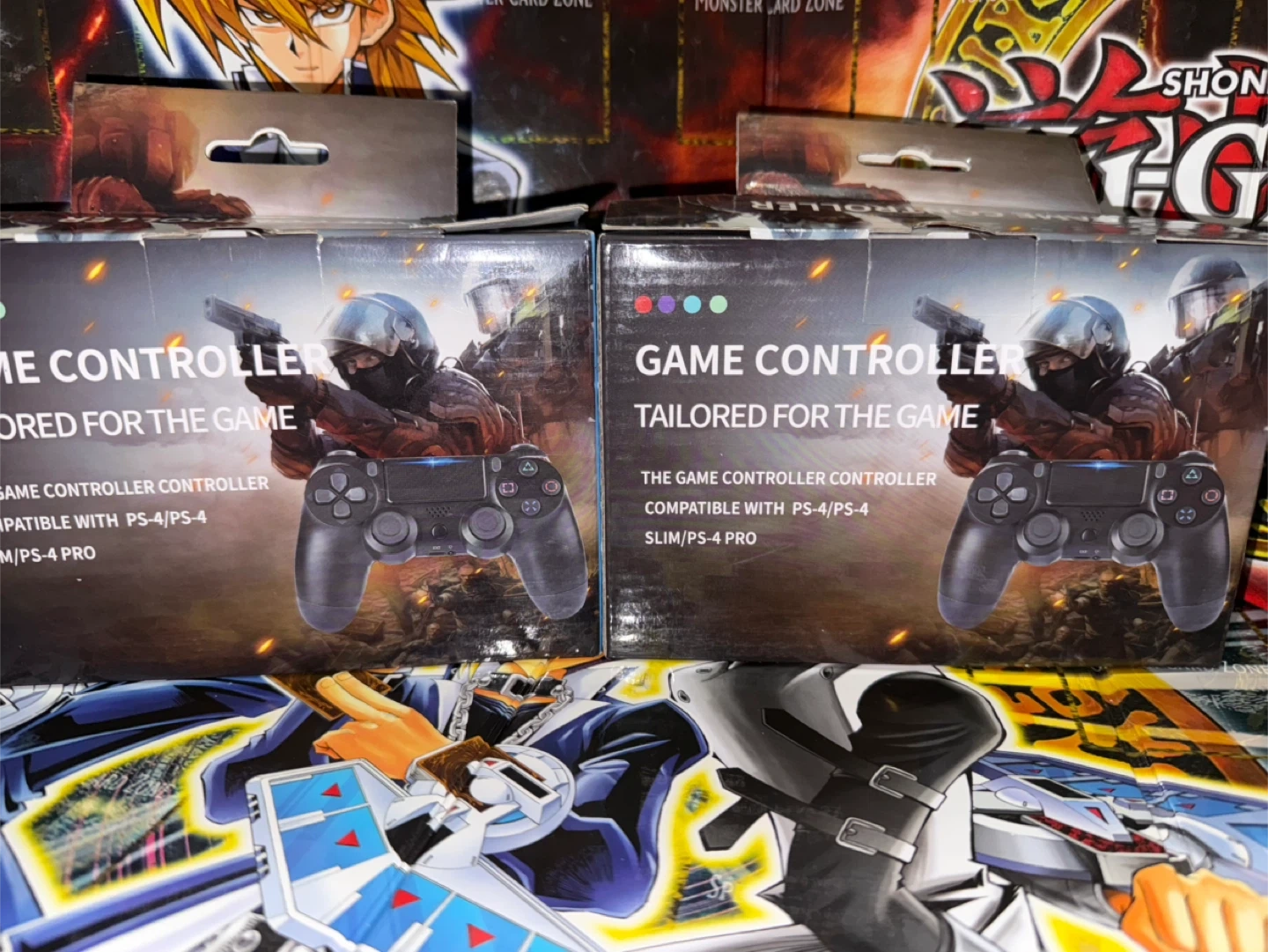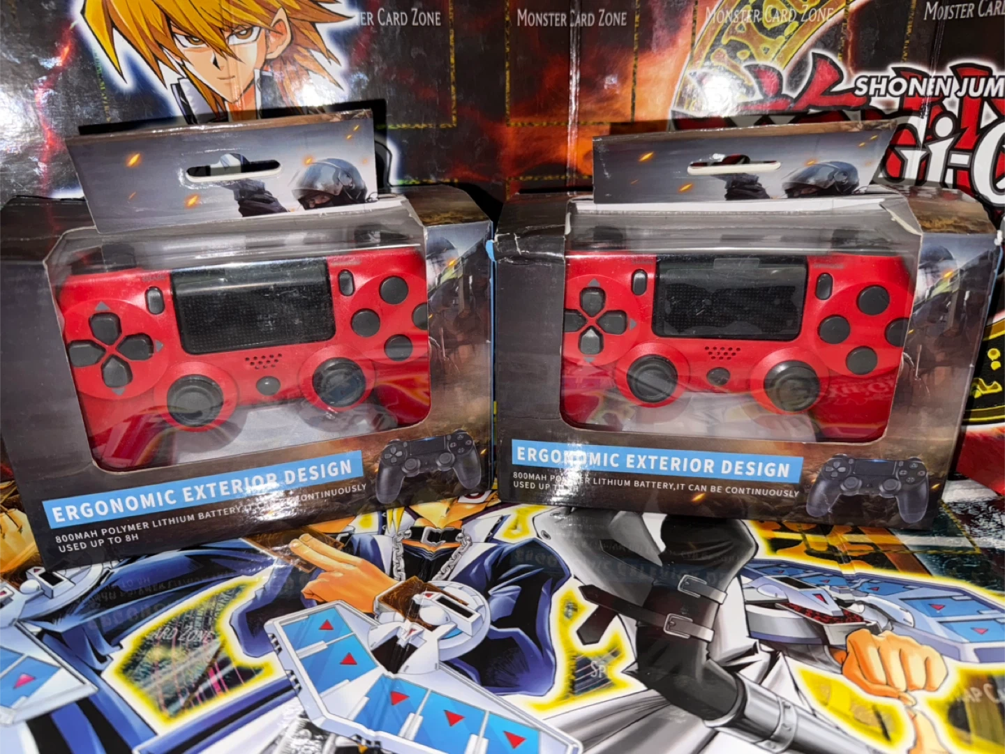 This game controller is designed for PS4. It's compatible with PS4/PS4 Slim/PS4 Pro. The red controller features an ergonomic exterior design and an 800mAh lithium battery. It can be used up to 8 hours continuously. The black controller is also designed for the game. Includes original packaging for both.