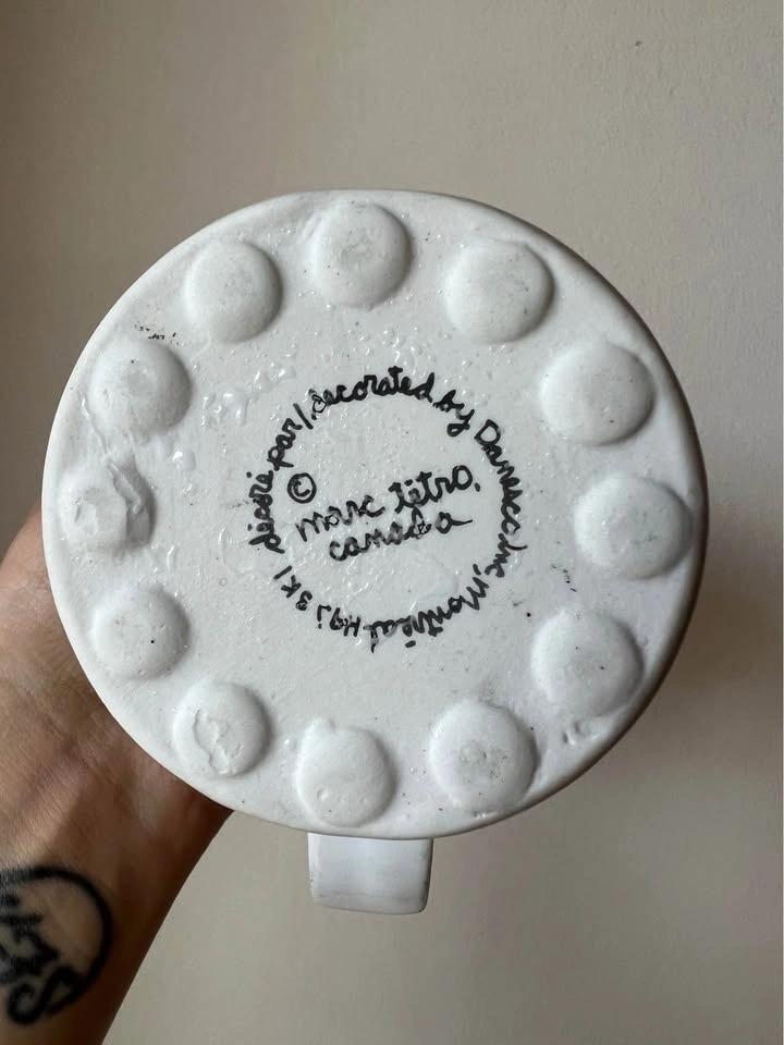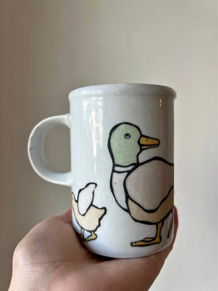 Marc Tetro "Canadiana Duck Family" coffee mug featuring an illustration of mallard ducks. The price reflects the wear on the mug - even though the colours have faded, it’s still a super cute coffee mug!