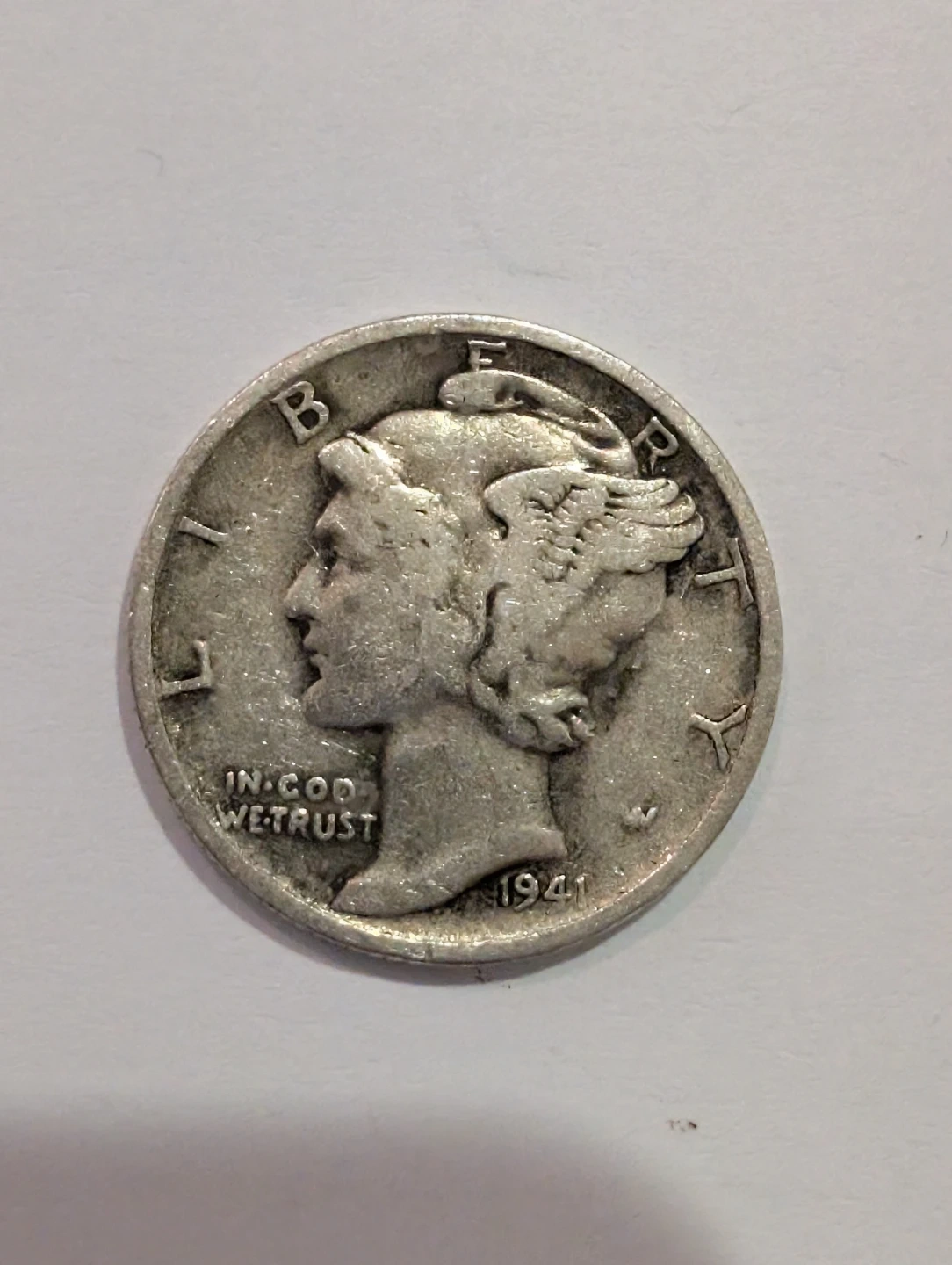 This is a 1941 Mercury Silver Dime in excellent condition. Obverse designer Adolph A weinman, composition silver fineness 0.900 (90%) weight 2.5 grams. Mint in Philadelphia.