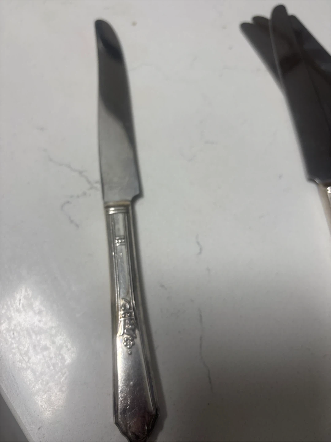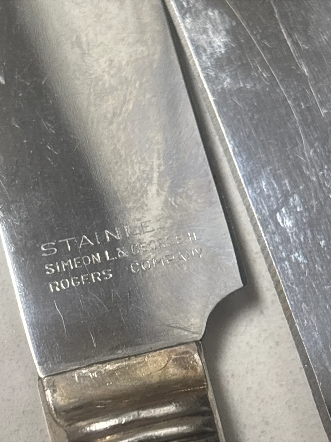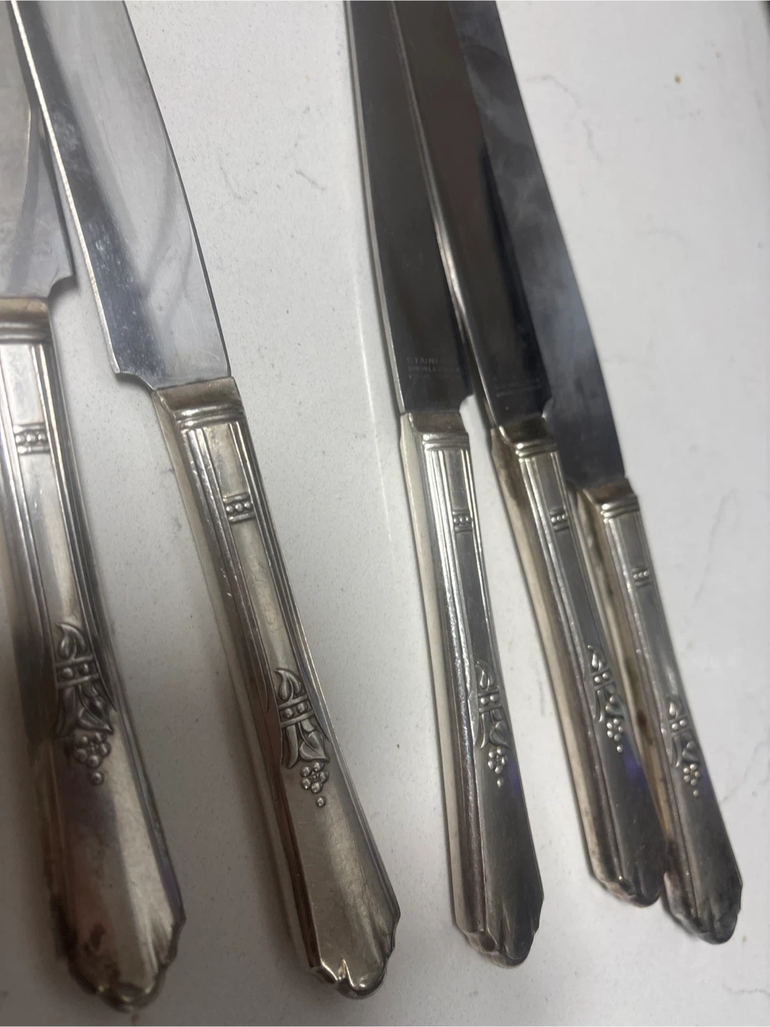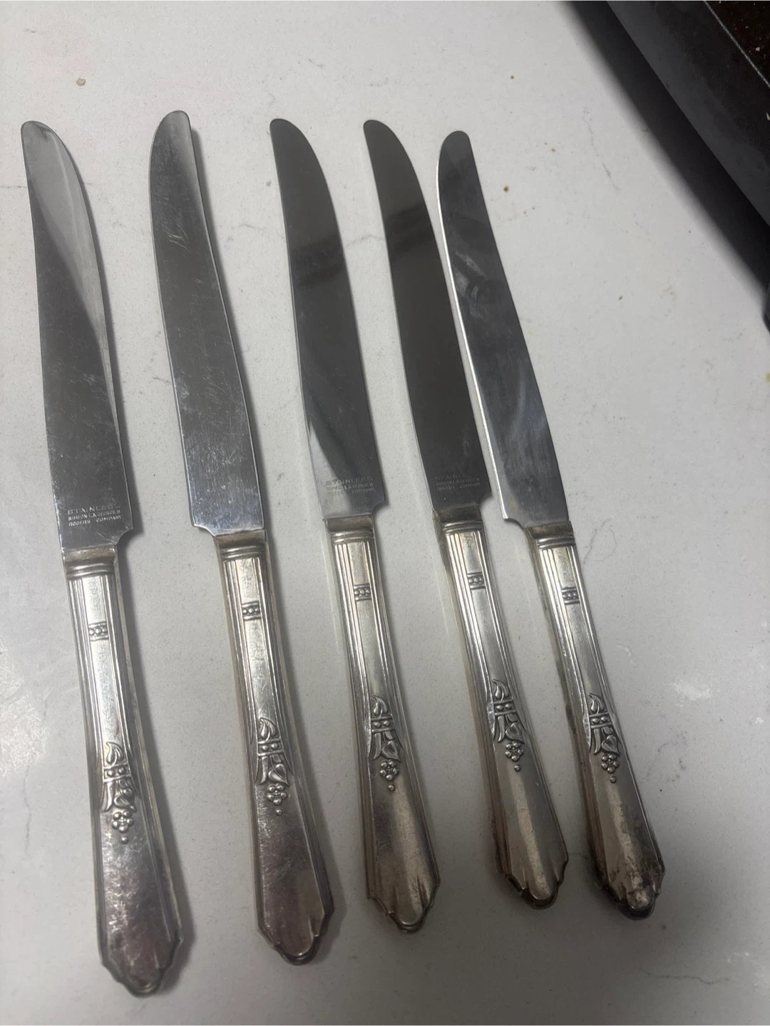 This is a set of five stainless steel knives with silver plated handles. They feature decorative handles with a vine motif. Made by Simeon L. & George II Rogers Company.