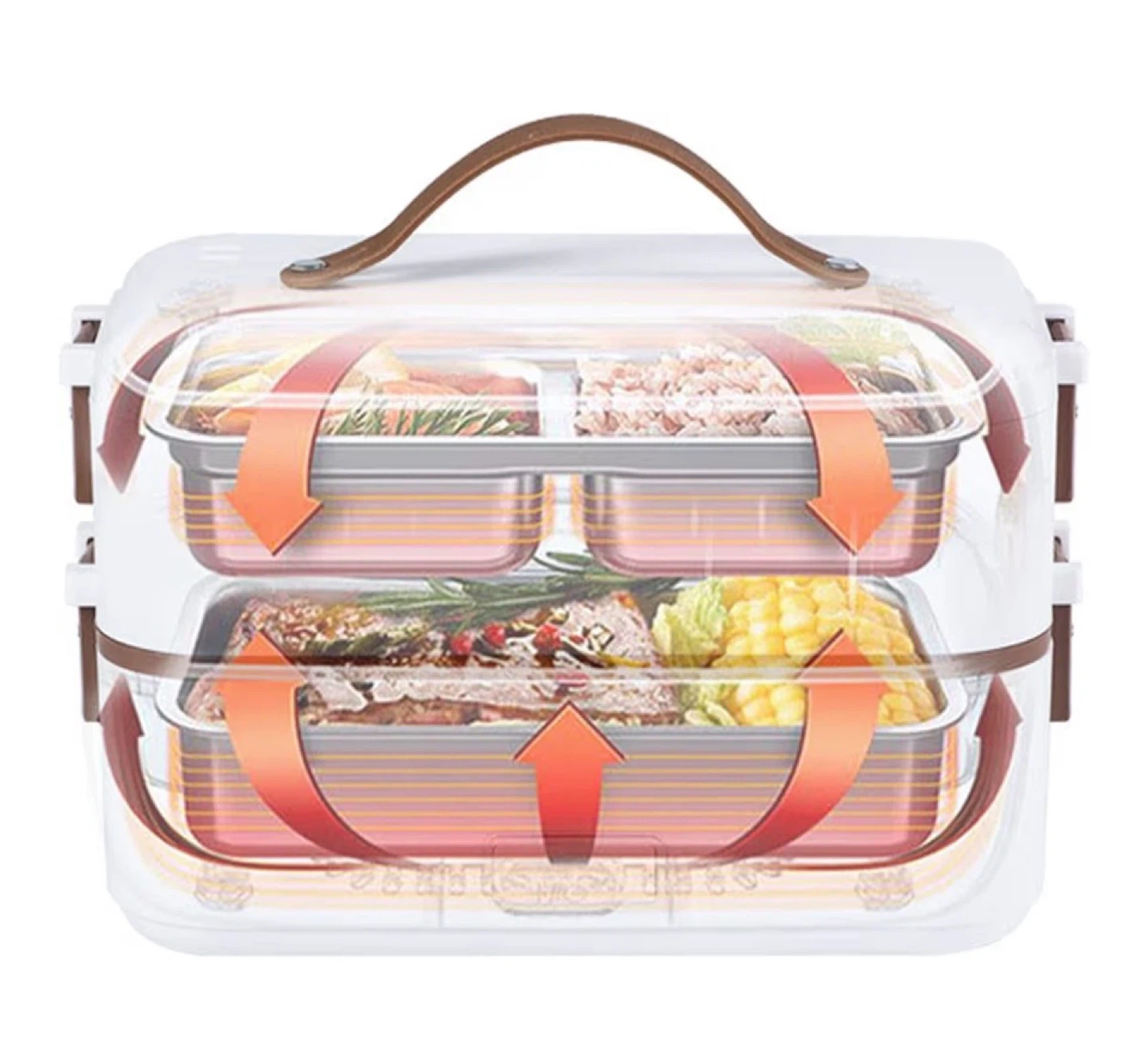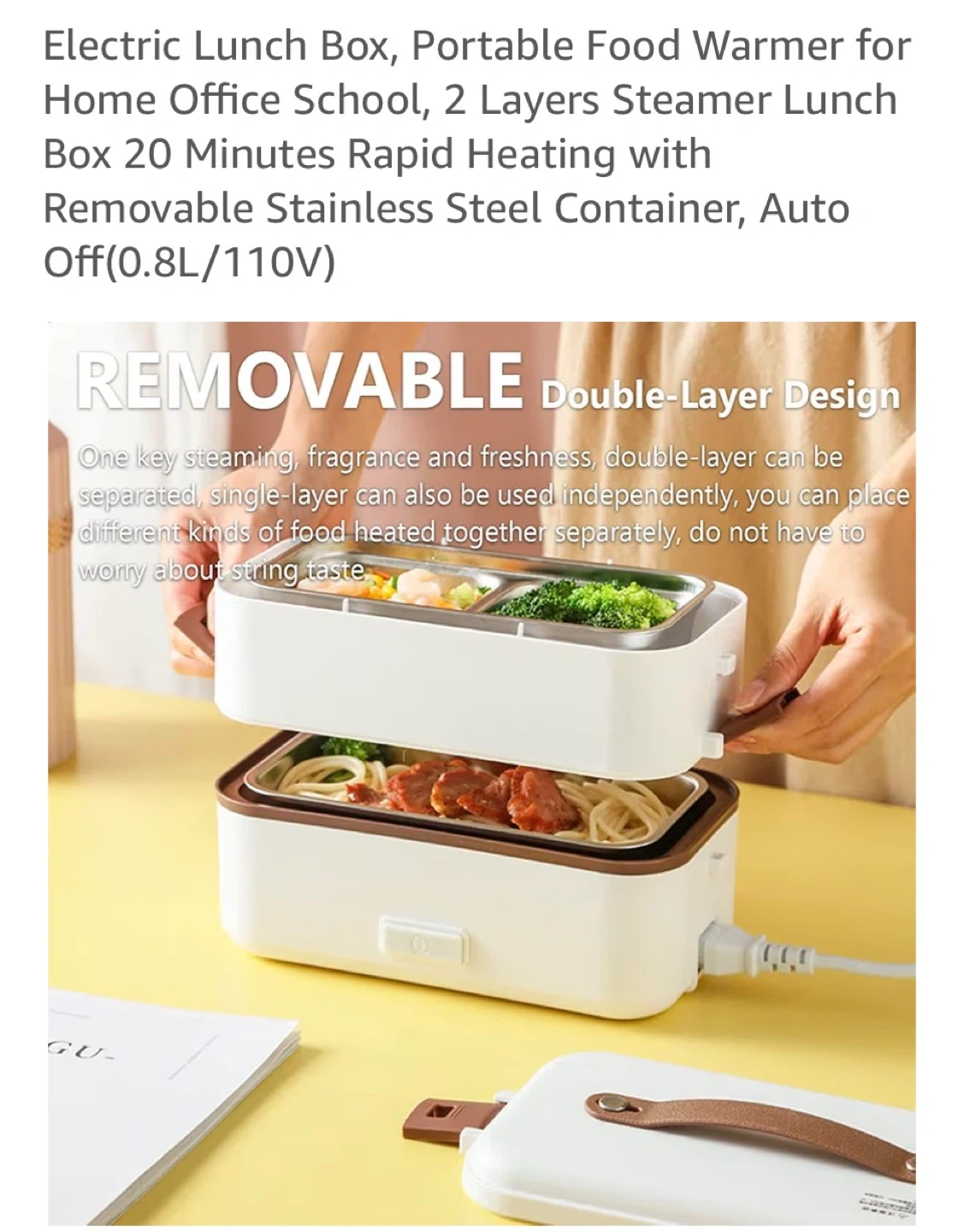 This electric lunch box offers 20 minutes of rapid heating. It has a 0.8L capacity and features removable stainless steel containers. The double-layer design allows for independent heating of different foods.