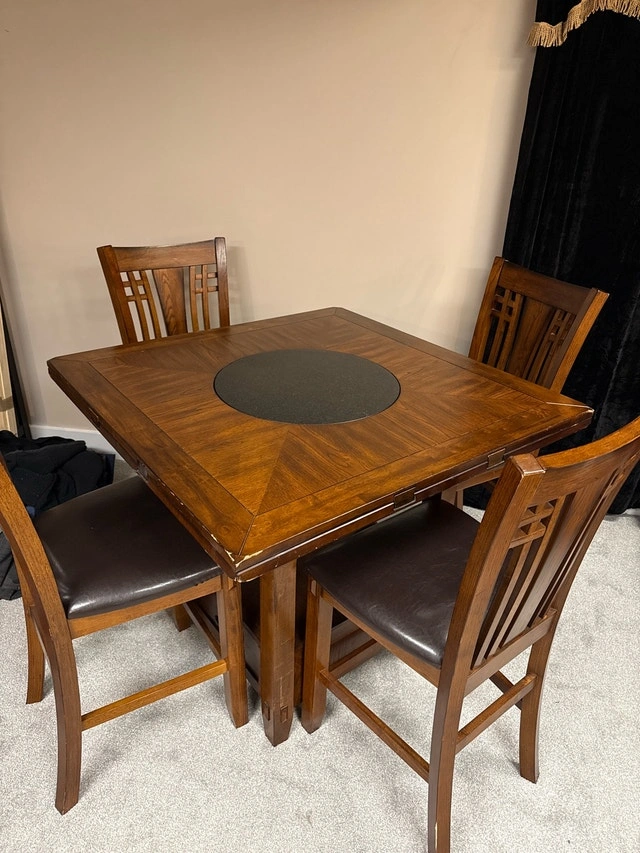 This high top dining set features a lazy susan centre and is perfect for smaller spaces. The set is in good condition and includes four chairs with brown leatherette. The wood is a warm pecan color. Cash accepted.