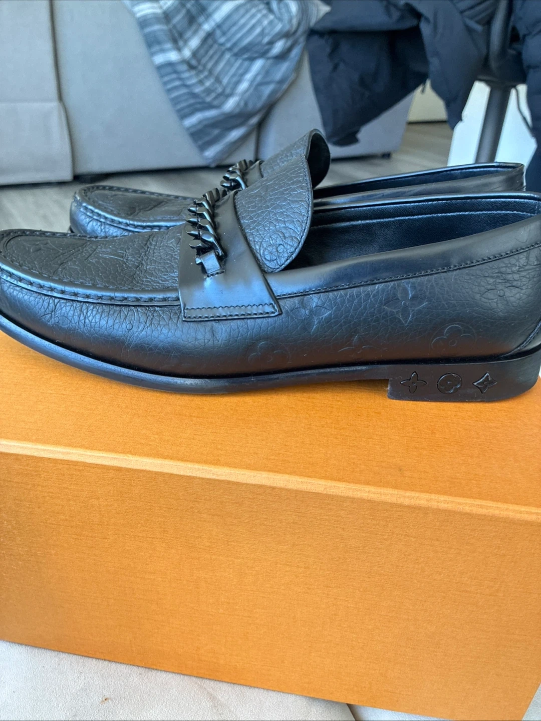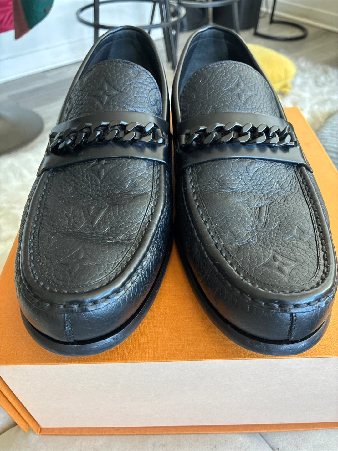 Black leather loafers from Louis Vuitton. These stylish shoes feature the iconic LV monogram embossed on the leather and a decorative chain across the vamp. Includes original box.