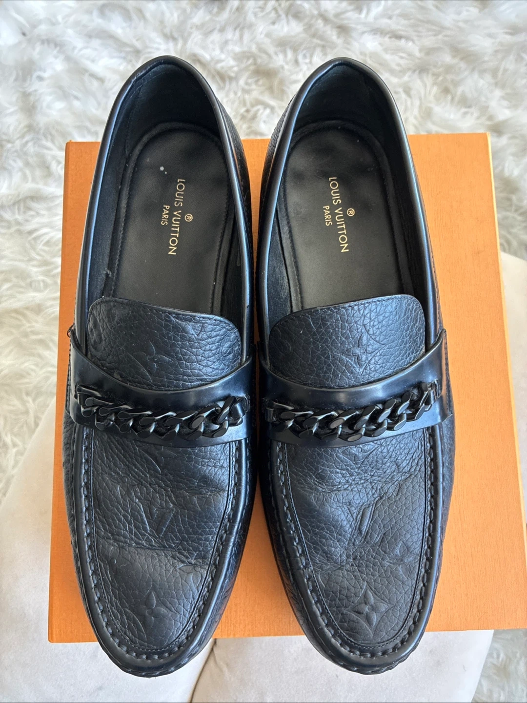 Black leather loafers from Louis Vuitton. These stylish shoes feature the iconic LV monogram embossed on the leather and a decorative chain across the vamp. Includes original box.