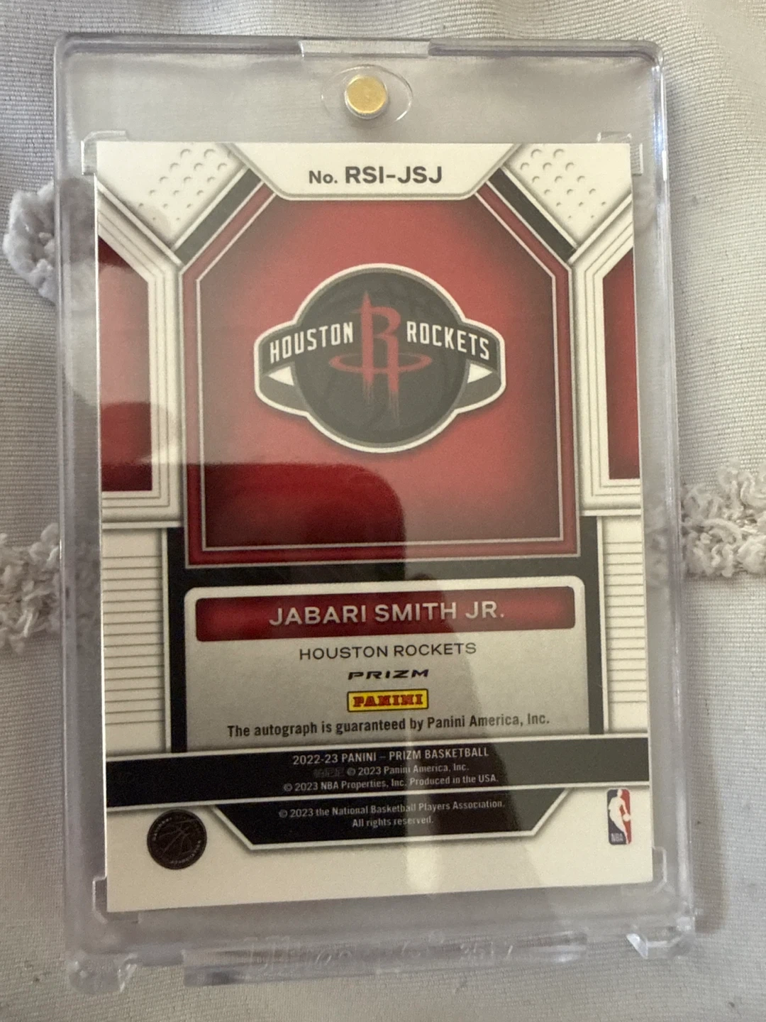 This is a 2022-23 Panini Prizm basketball card featuring Jabari Smith Jr. of the Houston Rockets. The card is autographed and guaranteed by Panini America, Inc. It's part of the 2022-23 Panini Prizm Basketball set. This card is a great addition for any collector!